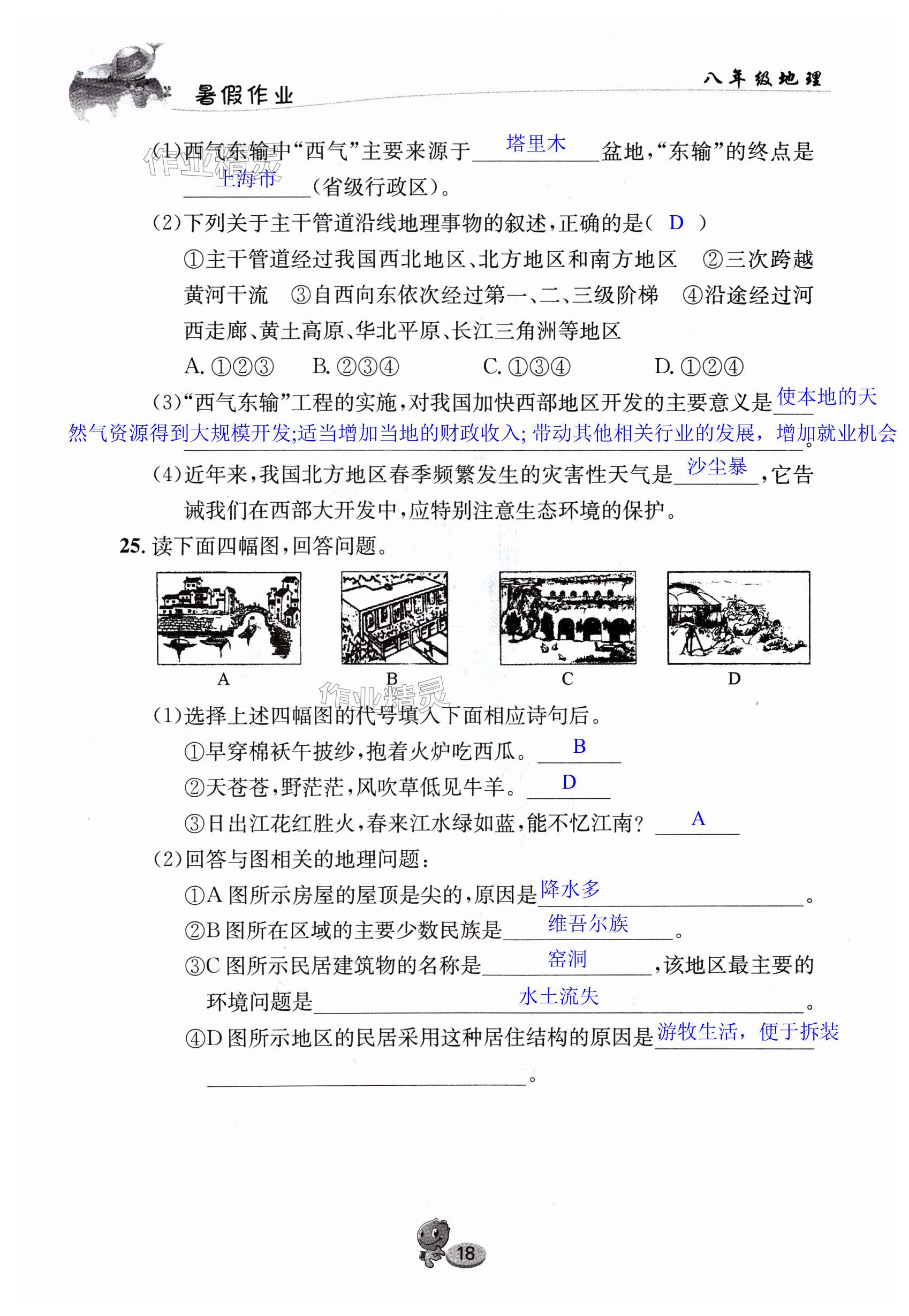 注:目前有些书本章节名称可能整理的还不是很完善,但都是按照顺序排列的,请同学们按照顺序仔细查找。练习册 2024年暑假作业长江出版社八年级地理人教版 答案主要是用来给同学们做完题方便对答案用的,请勿直接抄袭。