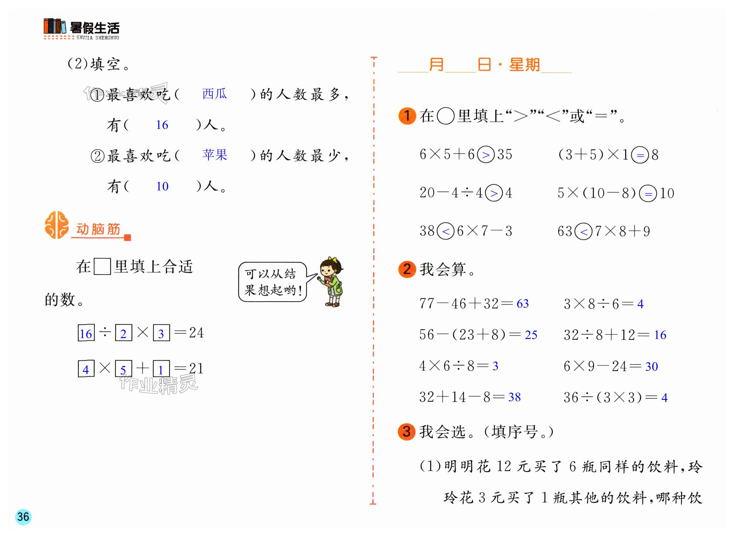 注:目前有些书本章节名称可能整理的还不是很完善,但都是按照顺序排列的,请同学们按照顺序仔细查找。练习册 2024年暑假作业安徽少年儿童出版社二年级数学人教版 答案主要是用来给同学们做完题方便对答案用的,请勿直接抄袭。