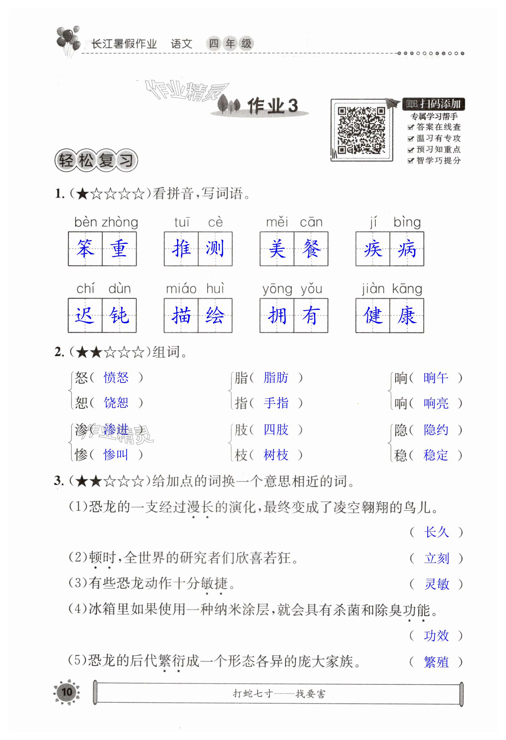 注:目前有些书本章节名称可能整理的还不是很完善,但都是按照顺序排列的,请同学们按照顺序仔细查找。练习册 2024年长江暑假作业四年级语文崇文书局 答案主要是用来给同学们做完题方便对答案用的,请勿直接抄袭。