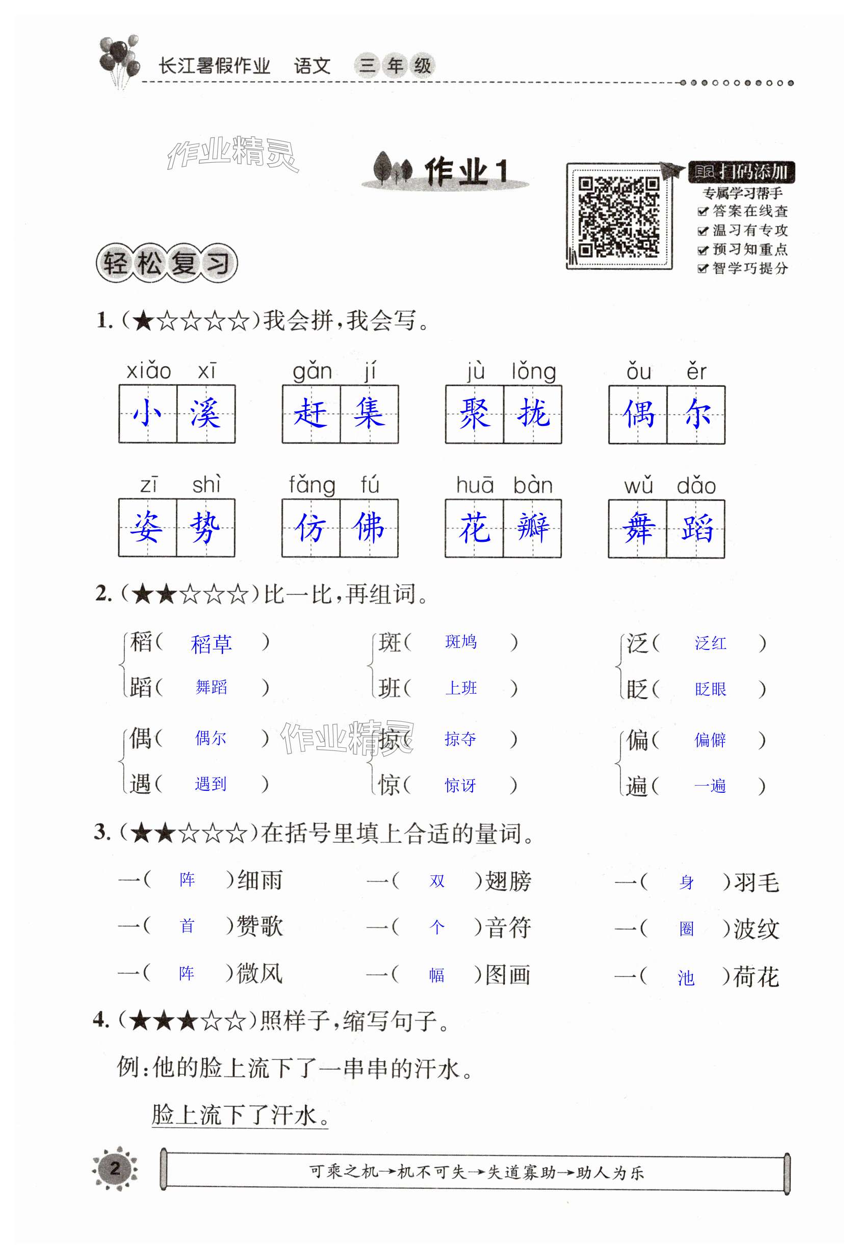 注:目前有些书本章节名称可能整理的还不是很完善,但都是按照顺序排列的,请同学们按照顺序仔细查找。练习册 2024年长江暑假作业三年级语文崇文书局 答案主要是用来给同学们做完题方便对答案用的,请勿直接抄袭。