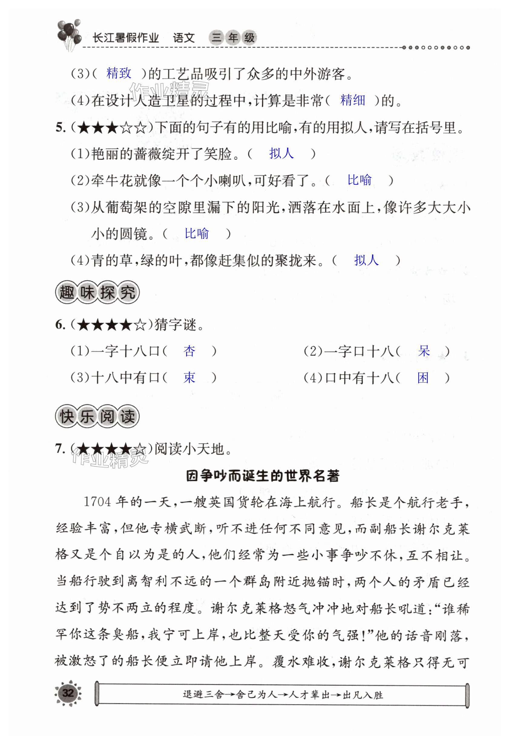 注:目前有些书本章节名称可能整理的还不是很完善,但都是按照顺序排列的,请同学们按照顺序仔细查找。练习册 2024年长江暑假作业三年级语文崇文书局 答案主要是用来给同学们做完题方便对答案用的,请勿直接抄袭。