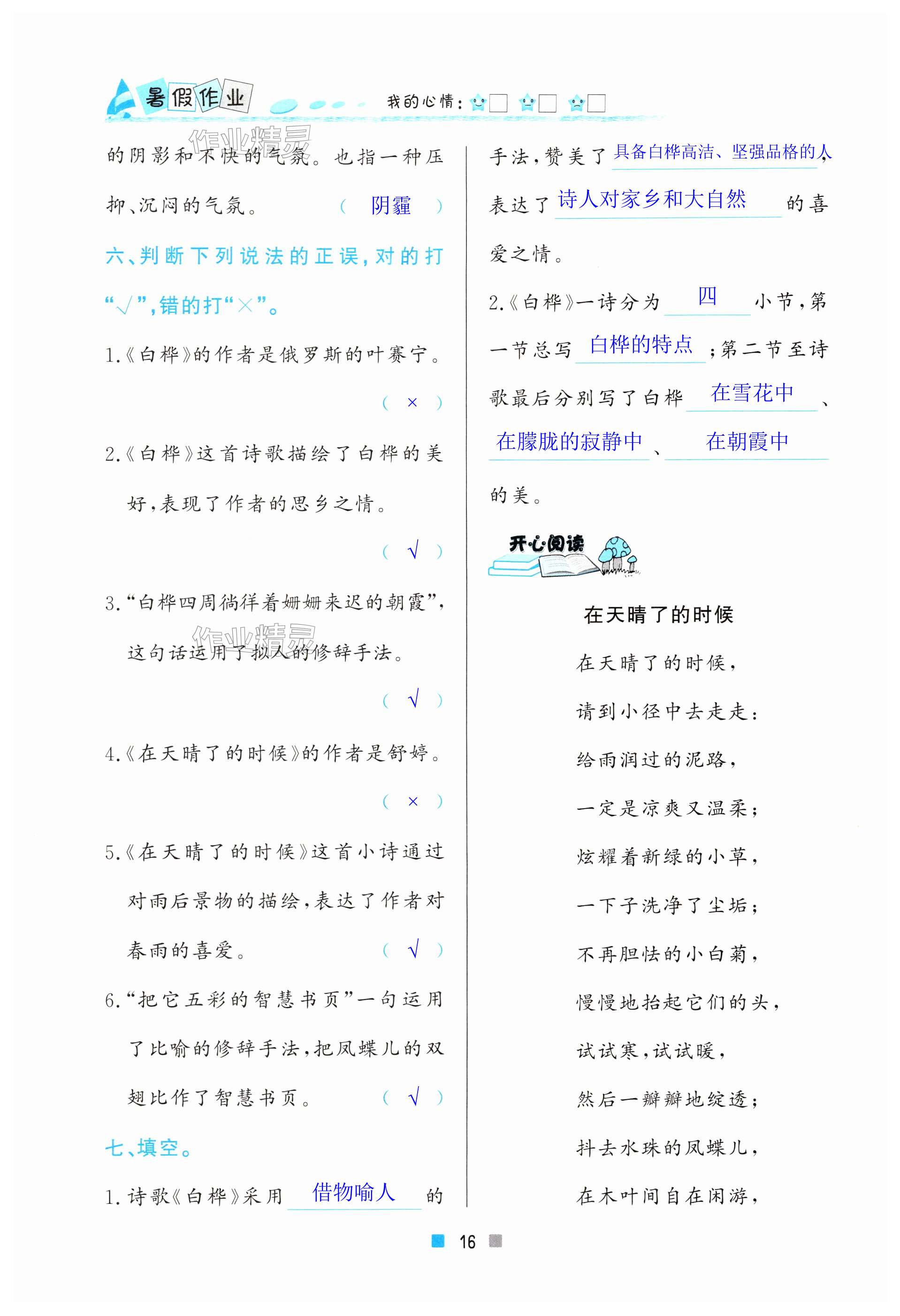 注:目前有些书本章节名称可能整理的还不是很完善,但都是按照顺序排列的,请同学们按照顺序仔细查找。练习册 2024年暑假作业小学四年级语文北京教育出版社 答案主要是用来给同学们做完题方便对答案用的,请勿直接抄袭。
