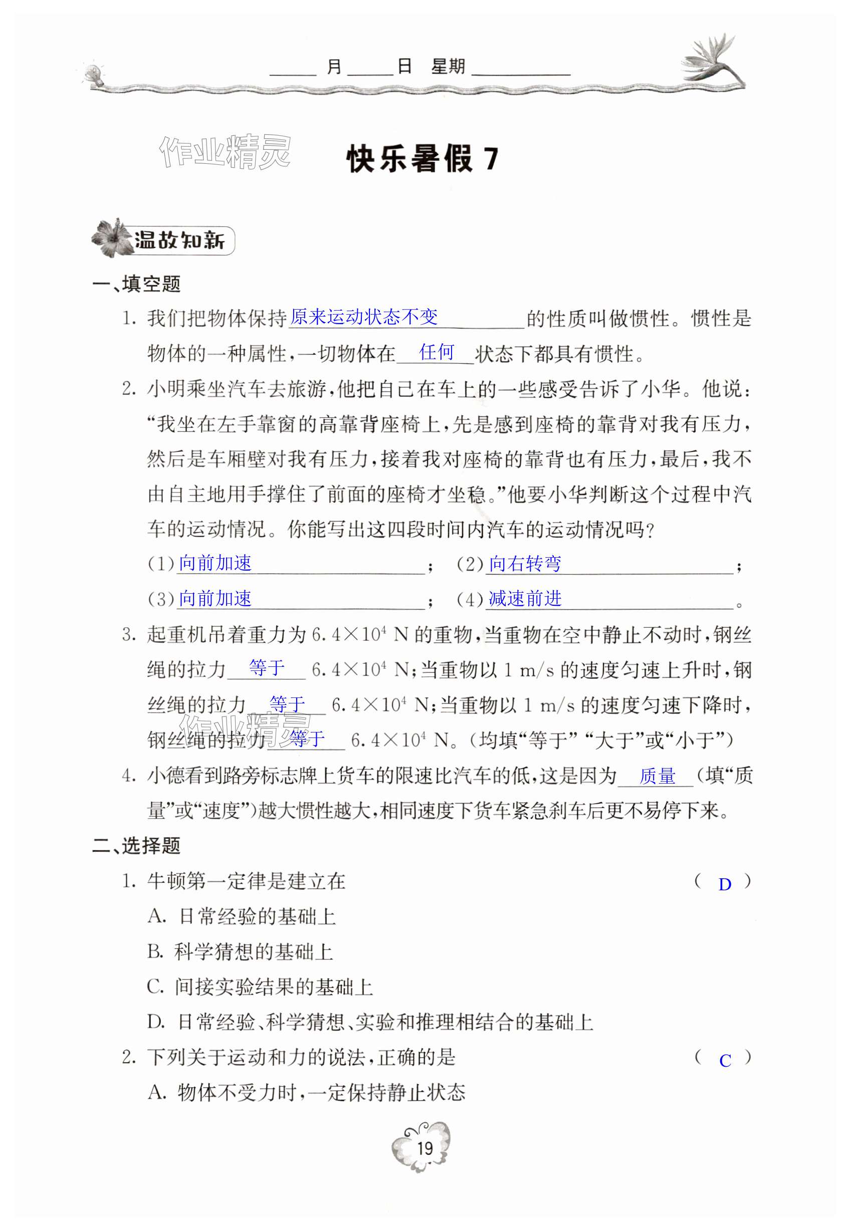 注:目前有些书本章节名称可能整理的还不是很完善,但都是按照顺序排列的,请同学们按照顺序仔细查找。练习册 2024年新课堂暑假生活八年级物理北京教育出版社 答案主要是用来给同学们做完题方便对答案用的,请勿直接抄袭。