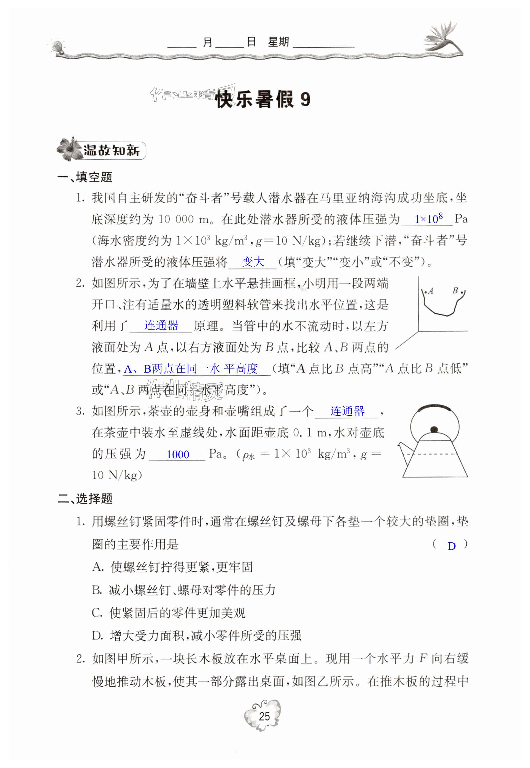 注:目前有些书本章节名称可能整理的还不是很完善,但都是按照顺序排列的,请同学们按照顺序仔细查找。练习册 2024年新课堂暑假生活八年级物理北京教育出版社 答案主要是用来给同学们做完题方便对答案用的,请勿直接抄袭。