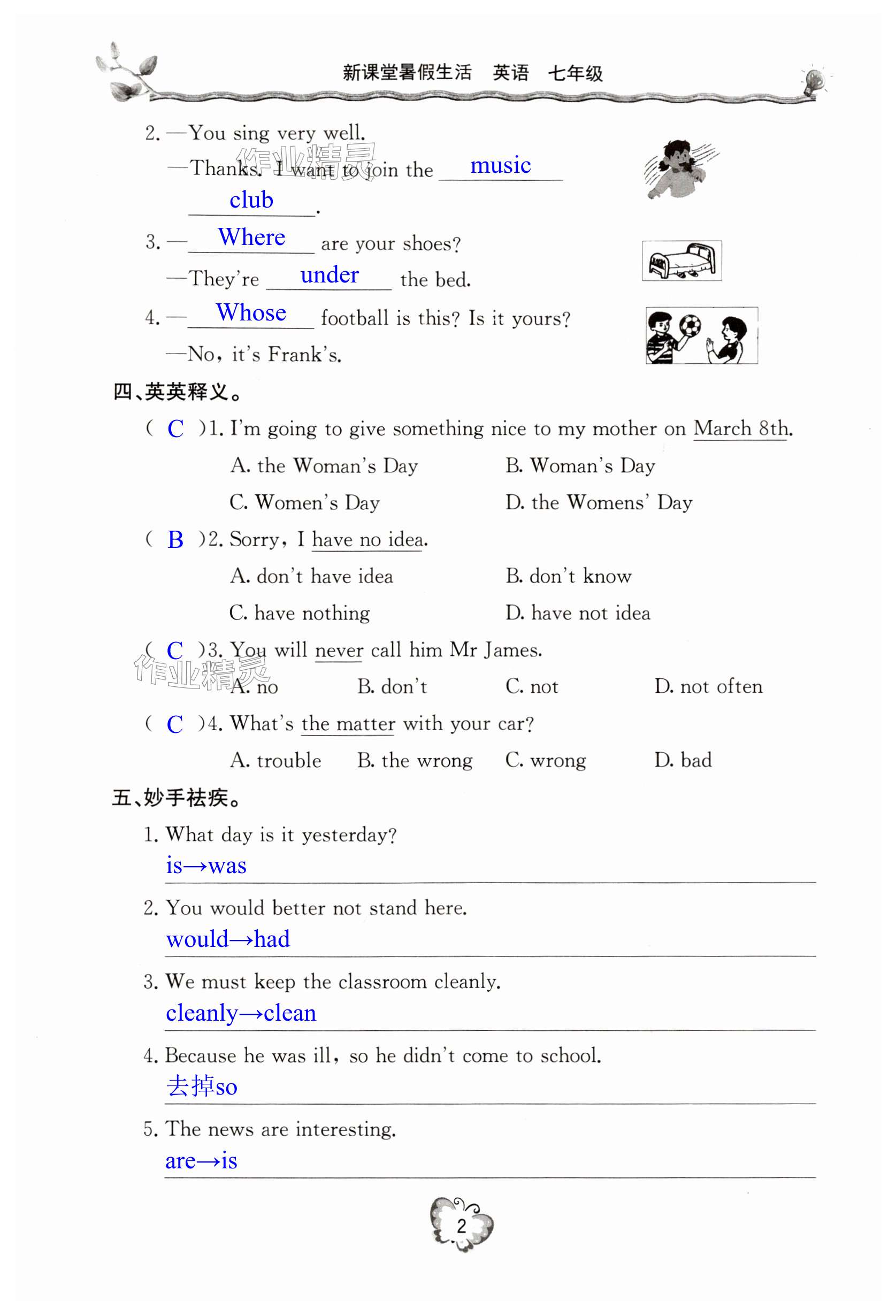 注:目前有些书本章节名称可能整理的还不是很完善,但都是按照顺序排列的,请同学们按照顺序仔细查找。练习册 2024年暑假生活七年级英语人教版北京教育出版社 答案主要是用来给同学们做完题方便对答案用的,请勿直接抄袭。