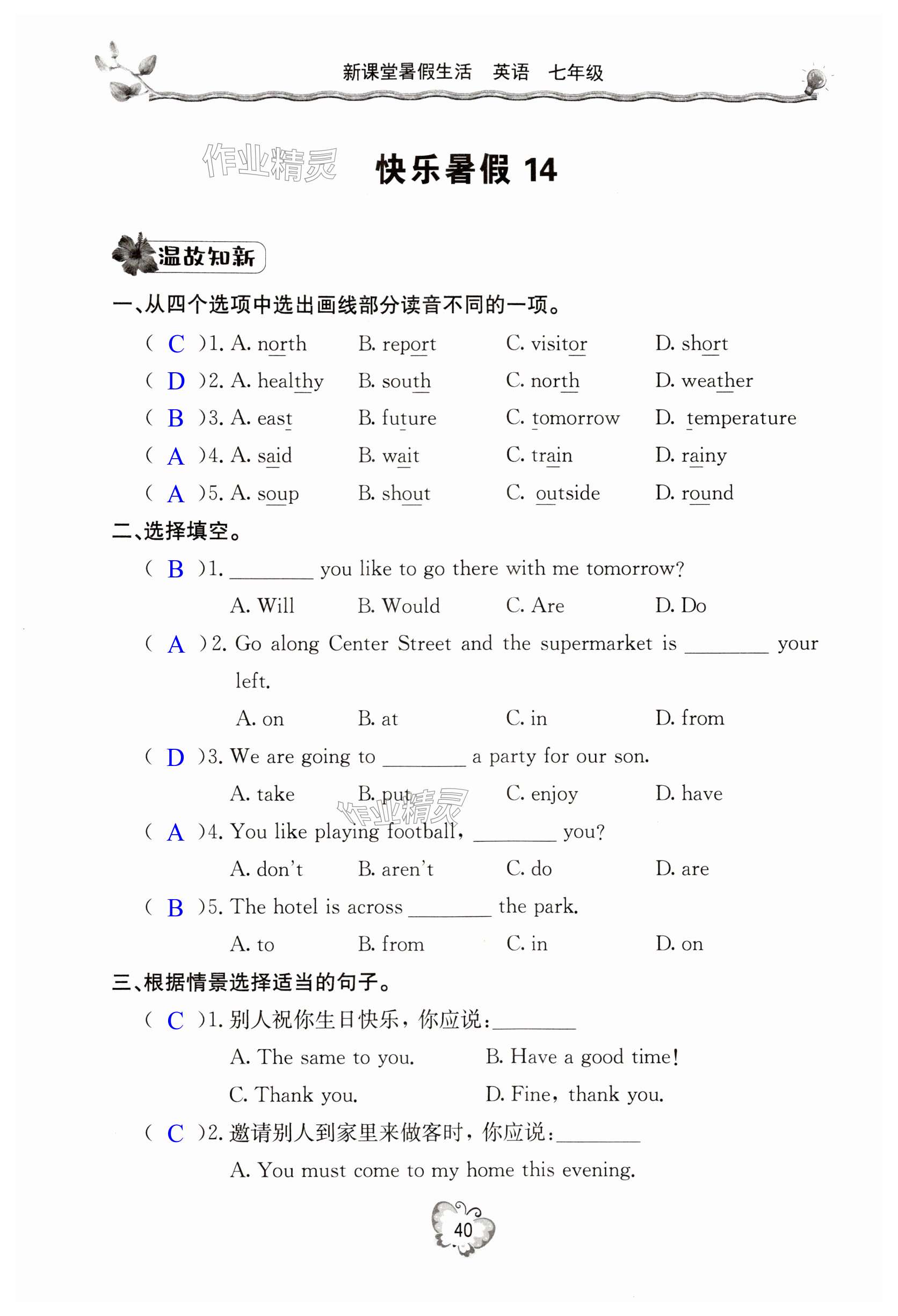 注:目前有些书本章节名称可能整理的还不是很完善,但都是按照顺序排列的,请同学们按照顺序仔细查找。练习册 2024年暑假生活七年级英语人教版北京教育出版社 答案主要是用来给同学们做完题方便对答案用的,请勿直接抄袭。