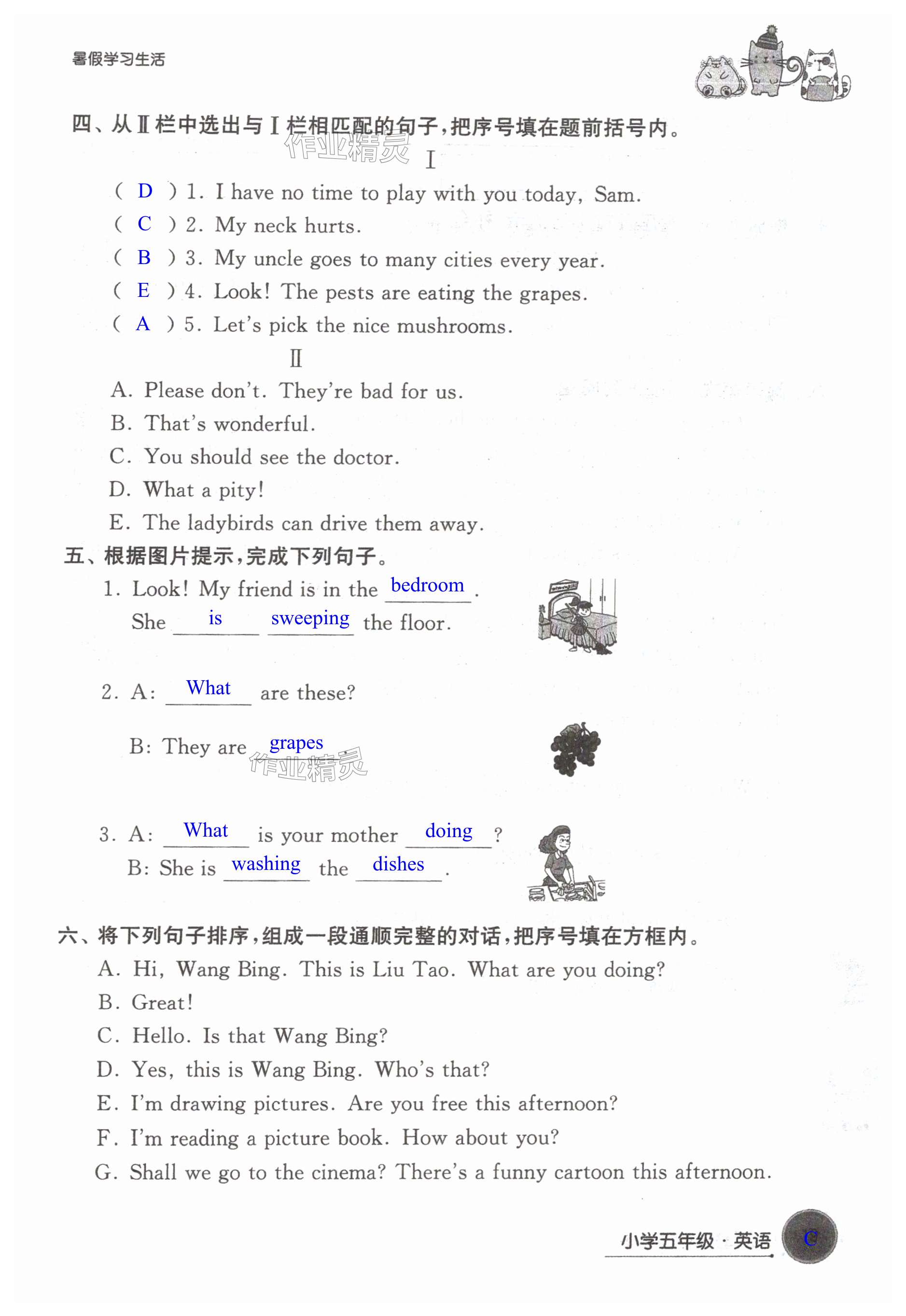注:目前有些书本章节名称可能整理的还不是很完善,但都是按照顺序排列的,请同学们按照顺序仔细查找。练习册 2024年暑假学习生活译林出版社五年级英语 答案主要是用来给同学们做完题方便对答案用的,请勿直接抄袭。