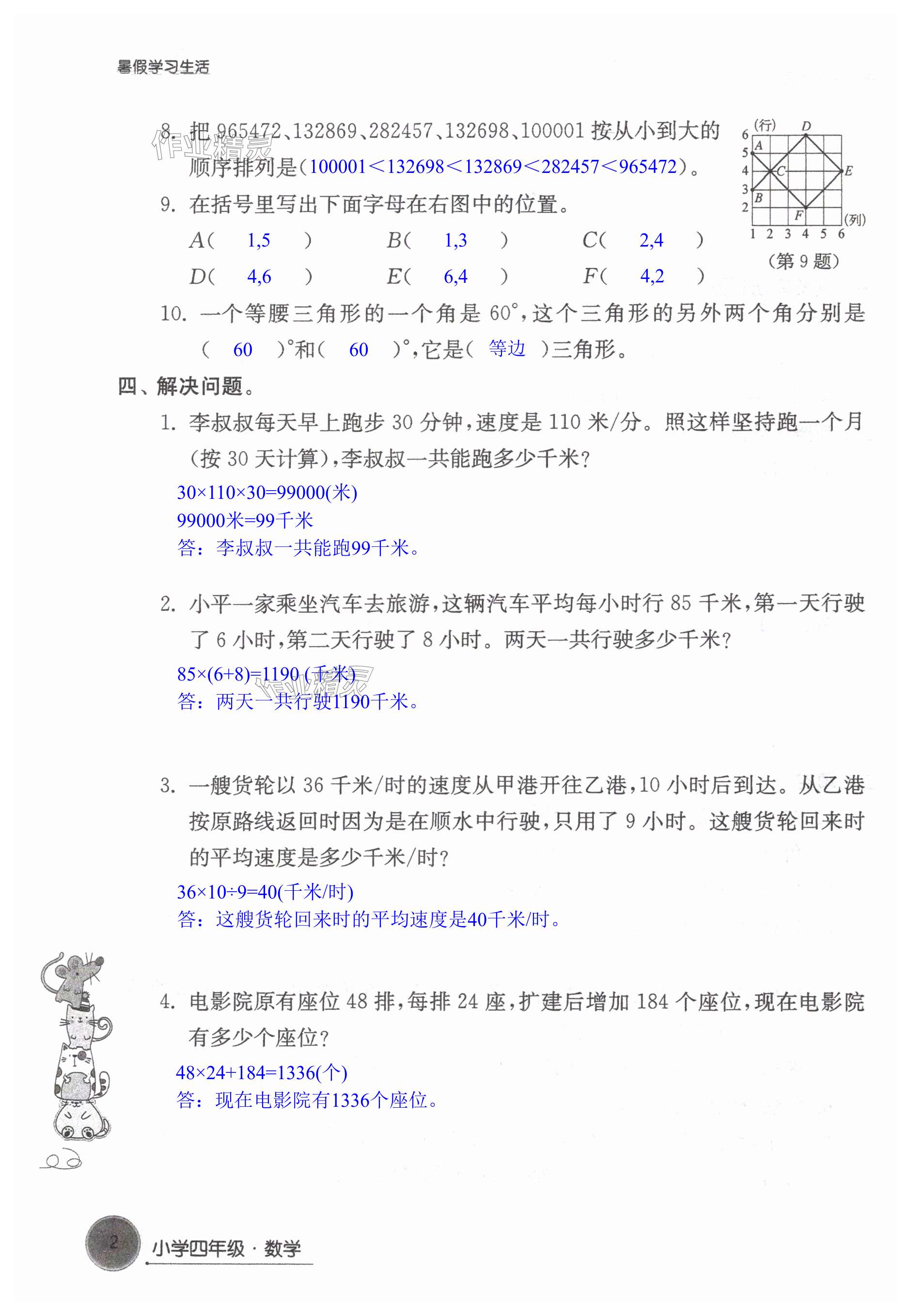 注:目前有些书本章节名称可能整理的还不是很完善,但都是按照顺序排列的,请同学们按照顺序仔细查找。练习册 2024年暑假学习生活译林出版社四年级数学 答案主要是用来给同学们做完题方便对答案用的,请勿直接抄袭。