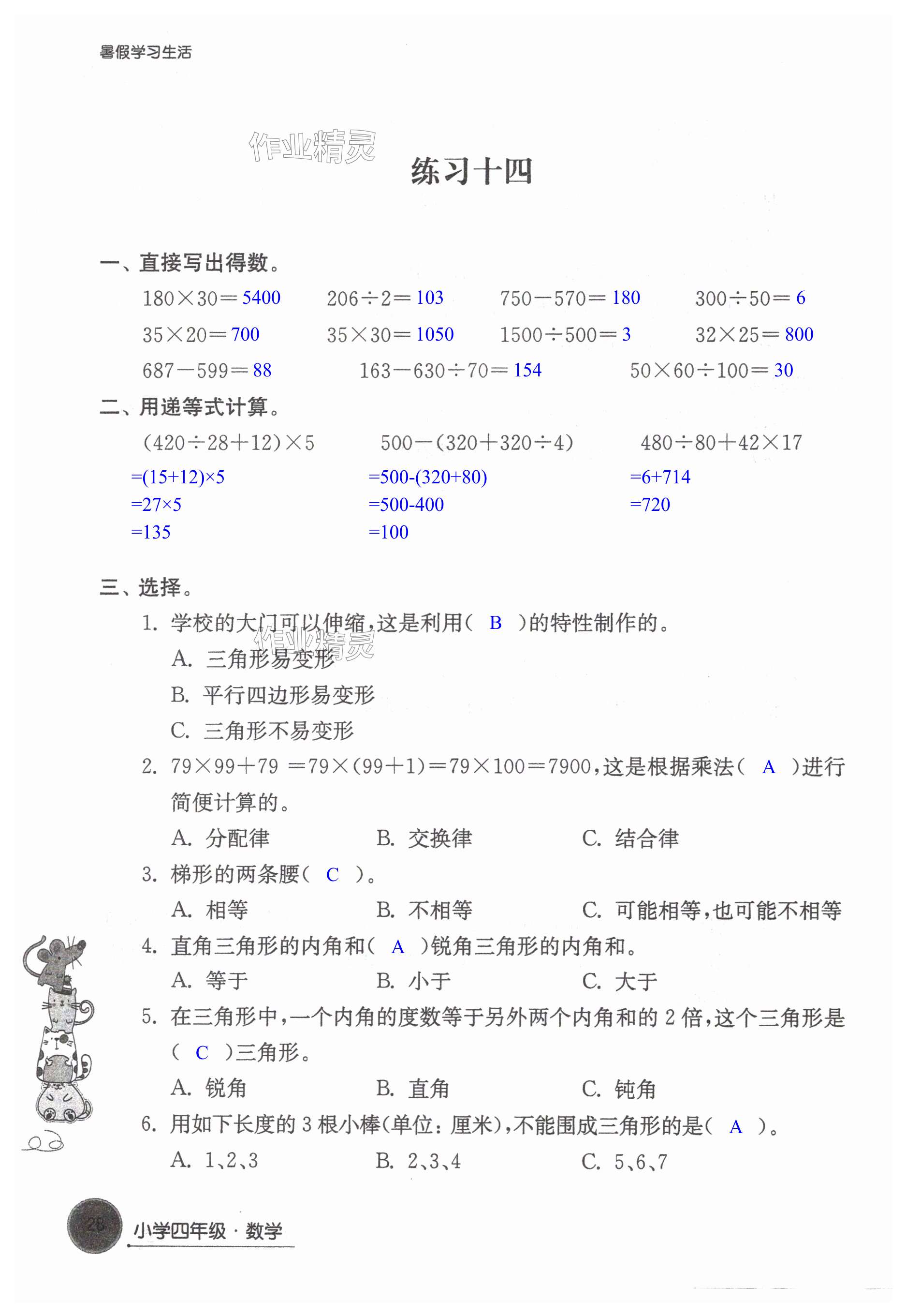 注:目前有些书本章节名称可能整理的还不是很完善,但都是按照顺序排列的,请同学们按照顺序仔细查找。练习册 2024年暑假学习生活译林出版社四年级数学 答案主要是用来给同学们做完题方便对答案用的,请勿直接抄袭。