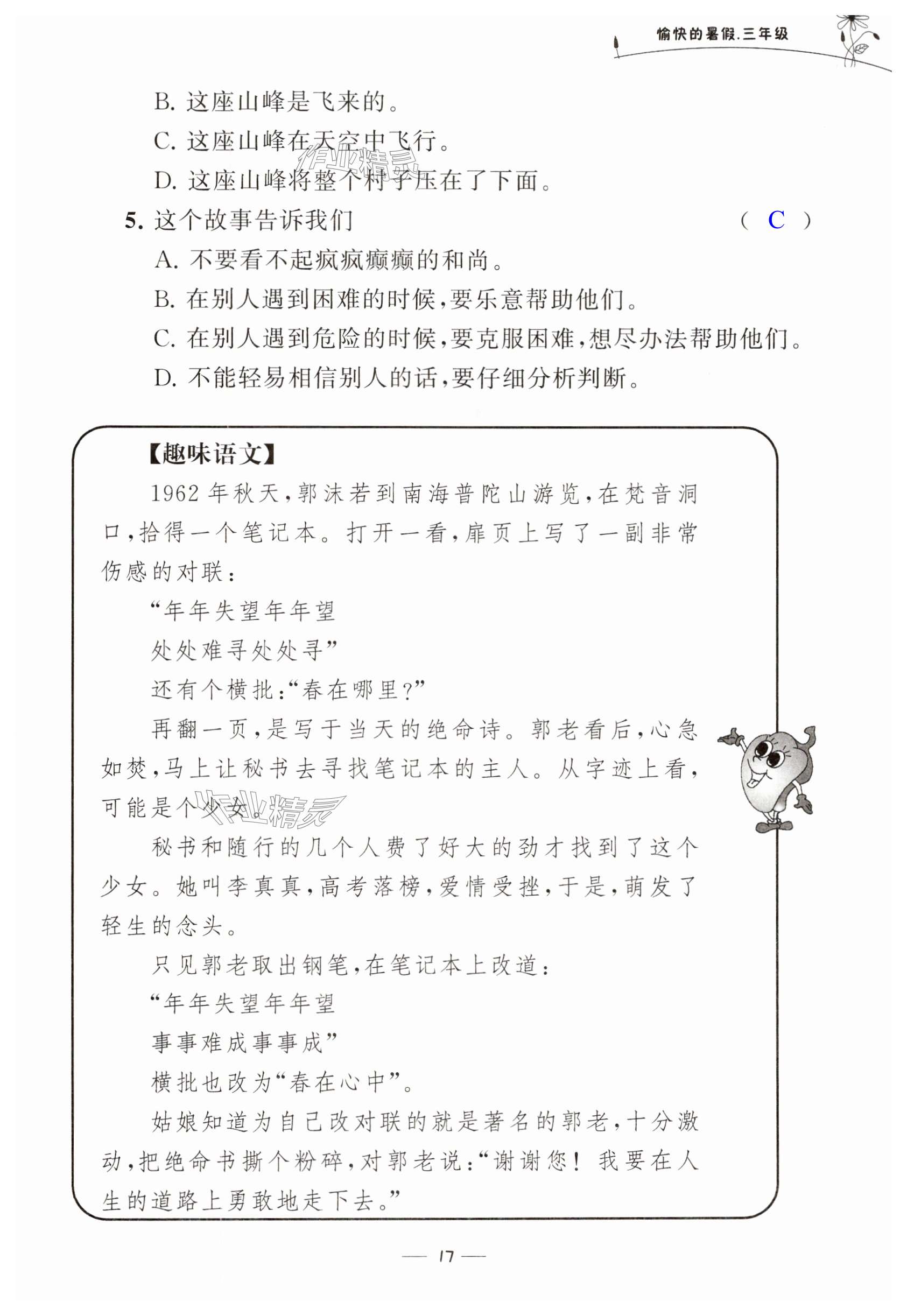 注:目前有些书本章节名称可能整理的还不是很完善,但都是按照顺序排列的,请同学们按照顺序仔细查找。练习册 2024年愉快的暑假江苏凤凰美术出版社三年级 答案主要是用来给同学们做完题方便对答案用的,请勿直接抄袭。