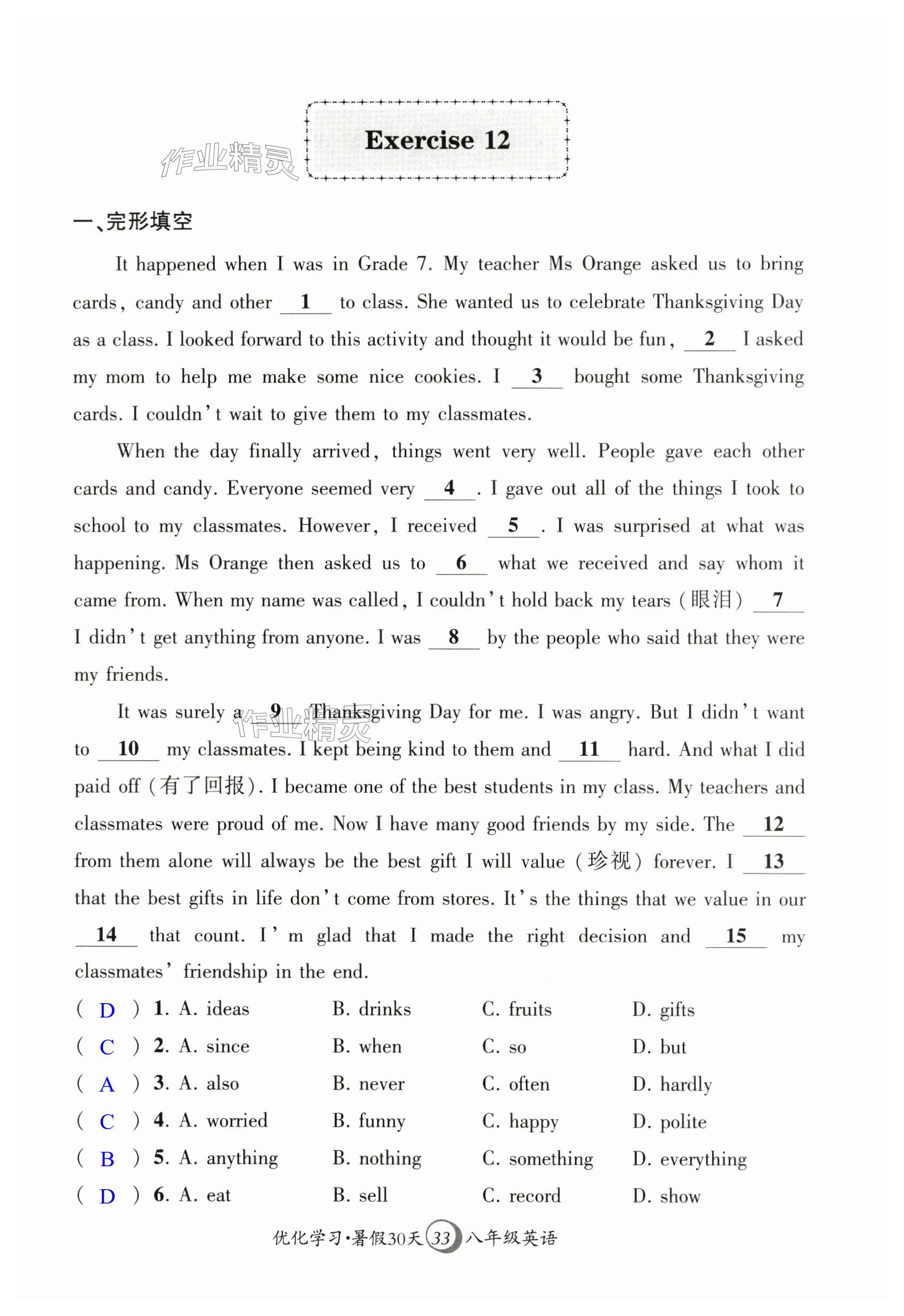 注:目前有些书本章节名称可能整理的还不是很完善,但都是按照顺序排列的,请同学们按照顺序仔细查找。练习册 2024年优化学习暑假30天八年级英语河海大学出版社 答案主要是用来给同学们做完题方便对答案用的,请勿直接抄袭。