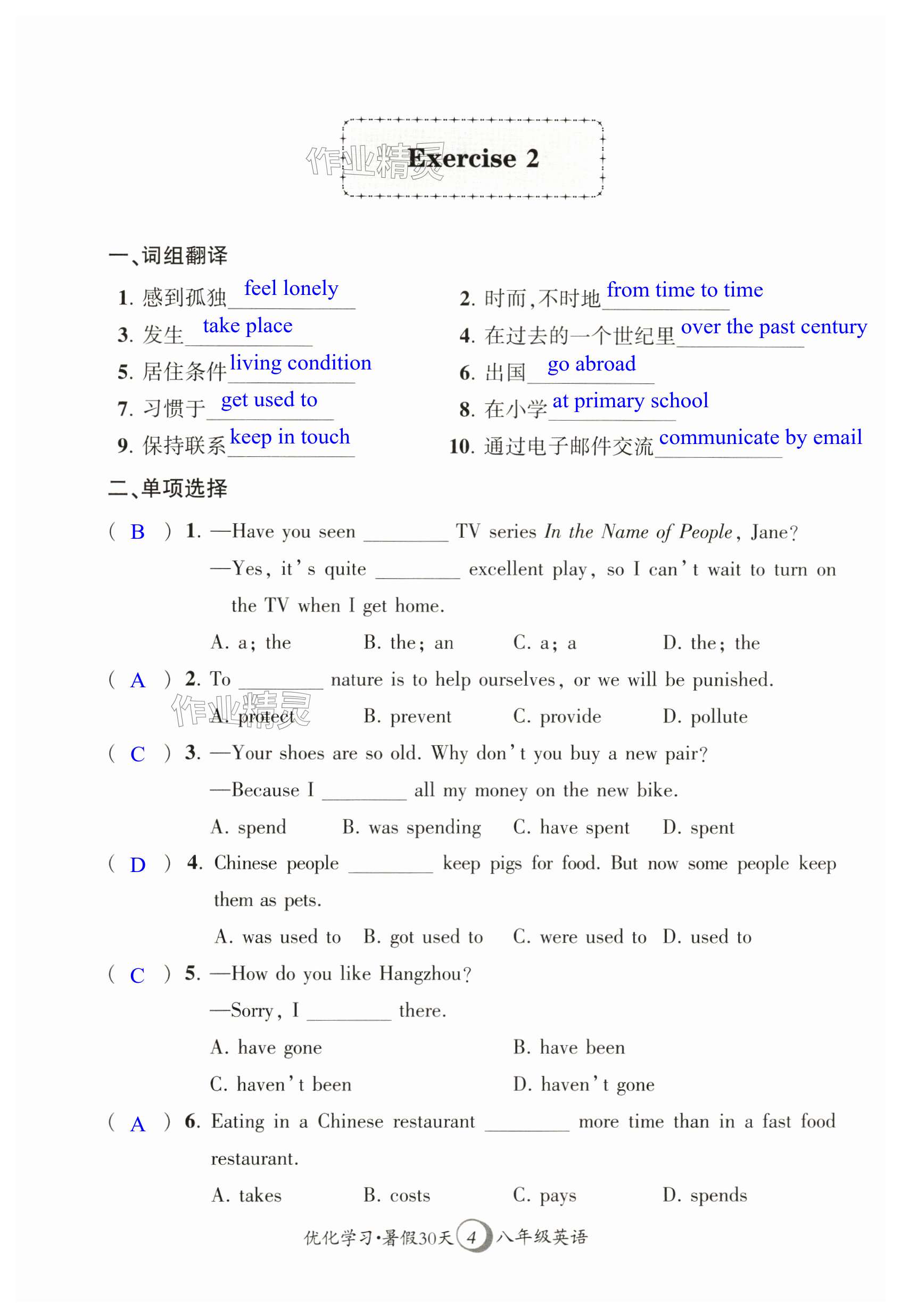 注:目前有些书本章节名称可能整理的还不是很完善,但都是按照顺序排列的,请同学们按照顺序仔细查找。练习册 2024年优化学习暑假30天八年级英语河海大学出版社 答案主要是用来给同学们做完题方便对答案用的,请勿直接抄袭。
