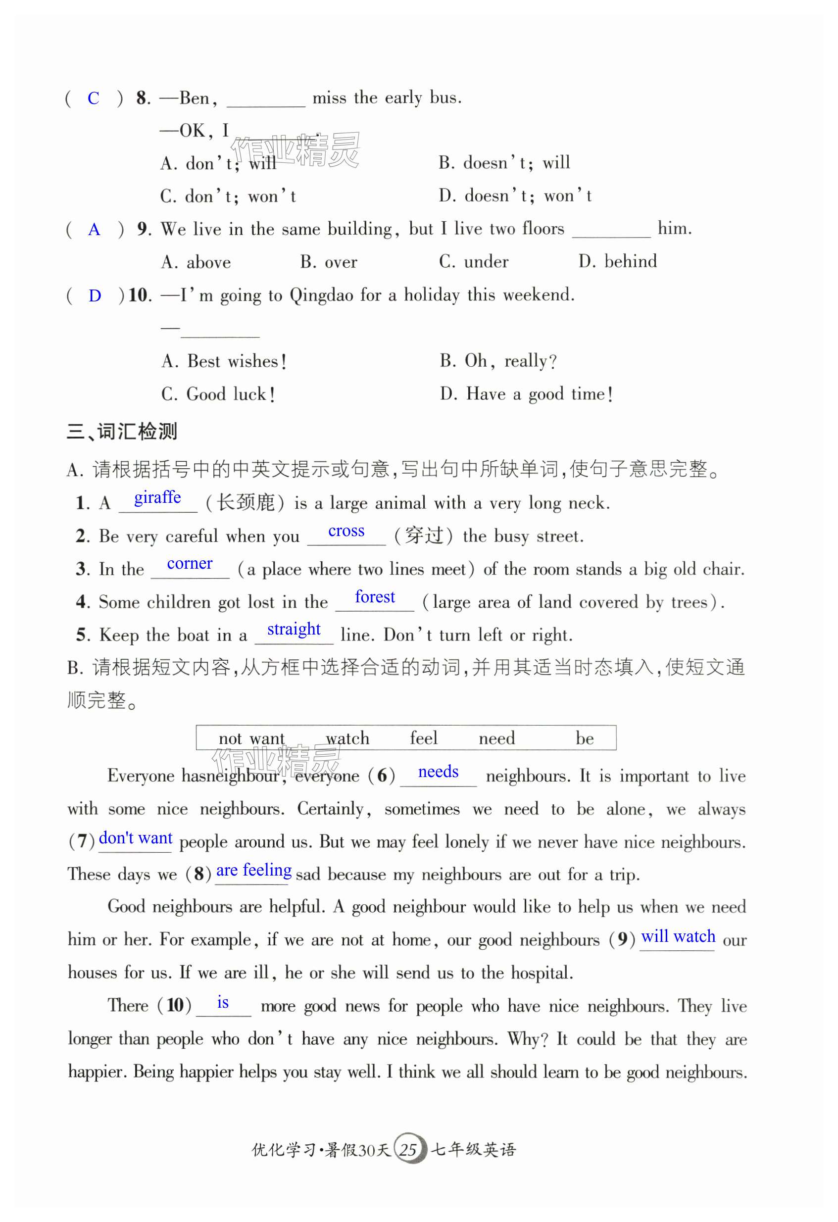 注:目前有些书本章节名称可能整理的还不是很完善,但都是按照顺序排列的,请同学们按照顺序仔细查找。练习册 2024年优化学习暑假30天七年级英语河海大学出版社 答案主要是用来给同学们做完题方便对答案用的,请勿直接抄袭。