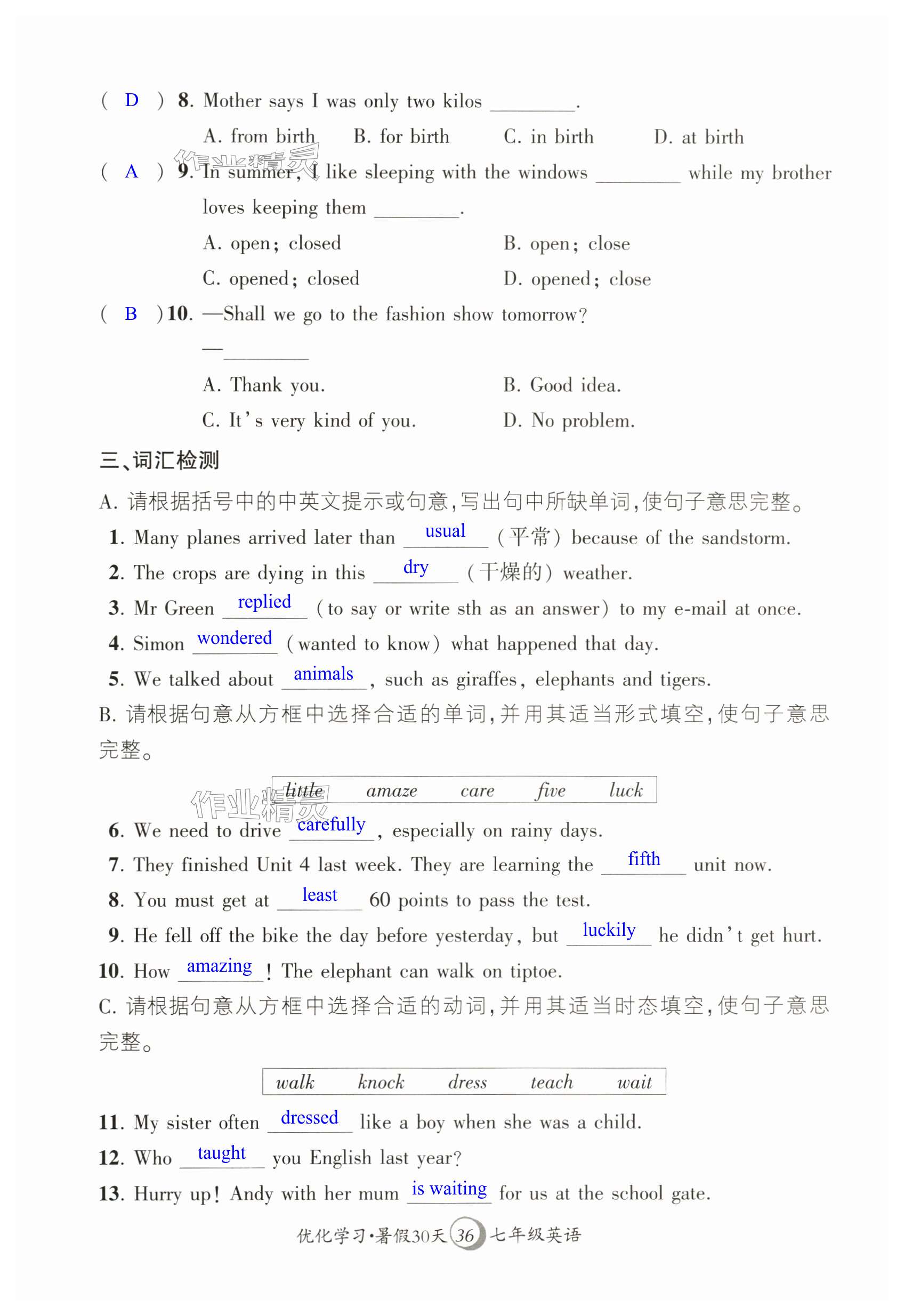 注:目前有些书本章节名称可能整理的还不是很完善,但都是按照顺序排列的,请同学们按照顺序仔细查找。练习册 2024年优化学习暑假30天七年级英语河海大学出版社 答案主要是用来给同学们做完题方便对答案用的,请勿直接抄袭。