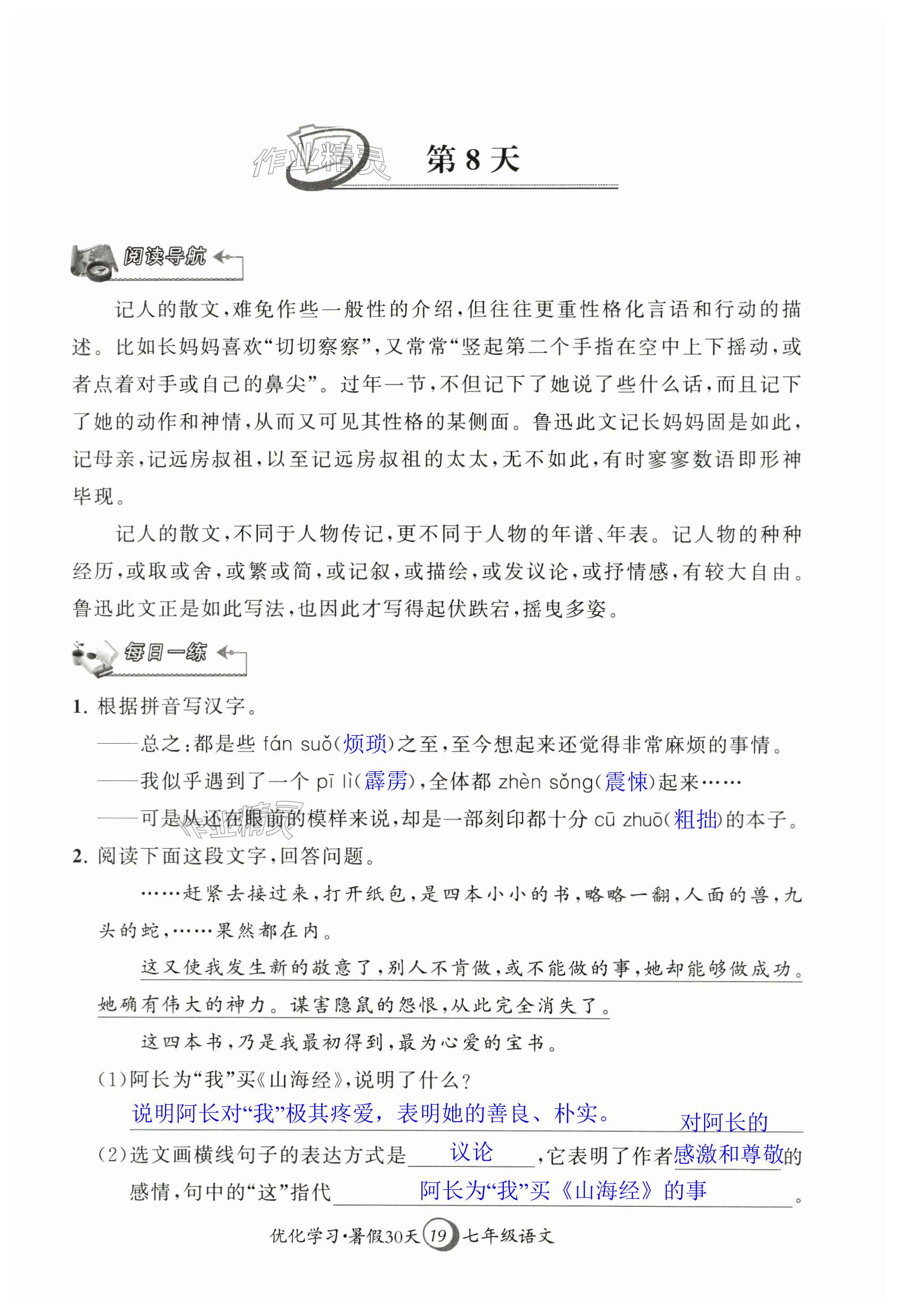 注:目前有些书本章节名称可能整理的还不是很完善,但都是按照顺序排列的,请同学们按照顺序仔细查找。练习册 2024年优化学习暑假30天七年级语文河海大学出版社 答案主要是用来给同学们做完题方便对答案用的,请勿直接抄袭。