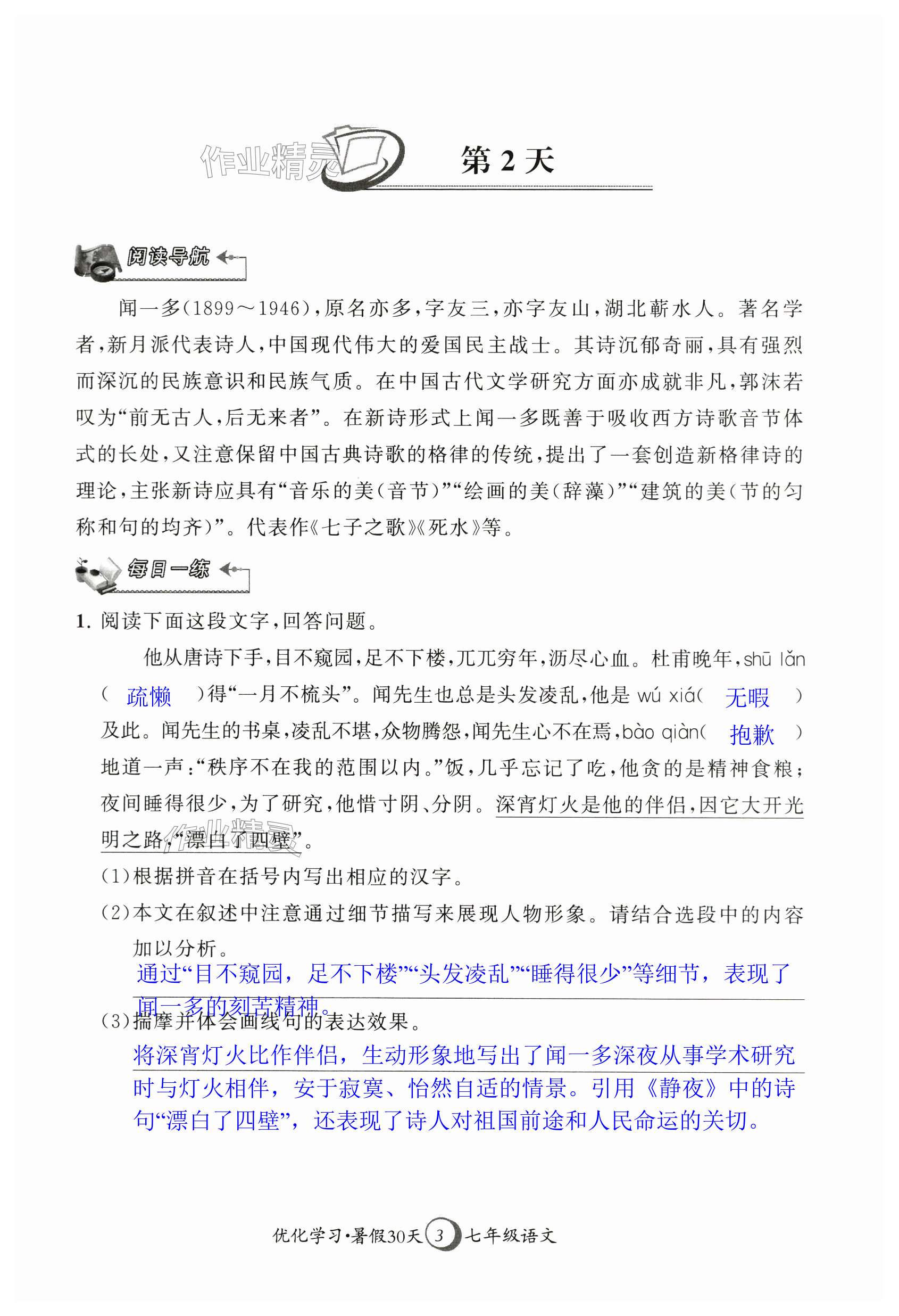 注:目前有些书本章节名称可能整理的还不是很完善,但都是按照顺序排列的,请同学们按照顺序仔细查找。练习册 2024年优化学习暑假30天七年级语文河海大学出版社 答案主要是用来给同学们做完题方便对答案用的,请勿直接抄袭。