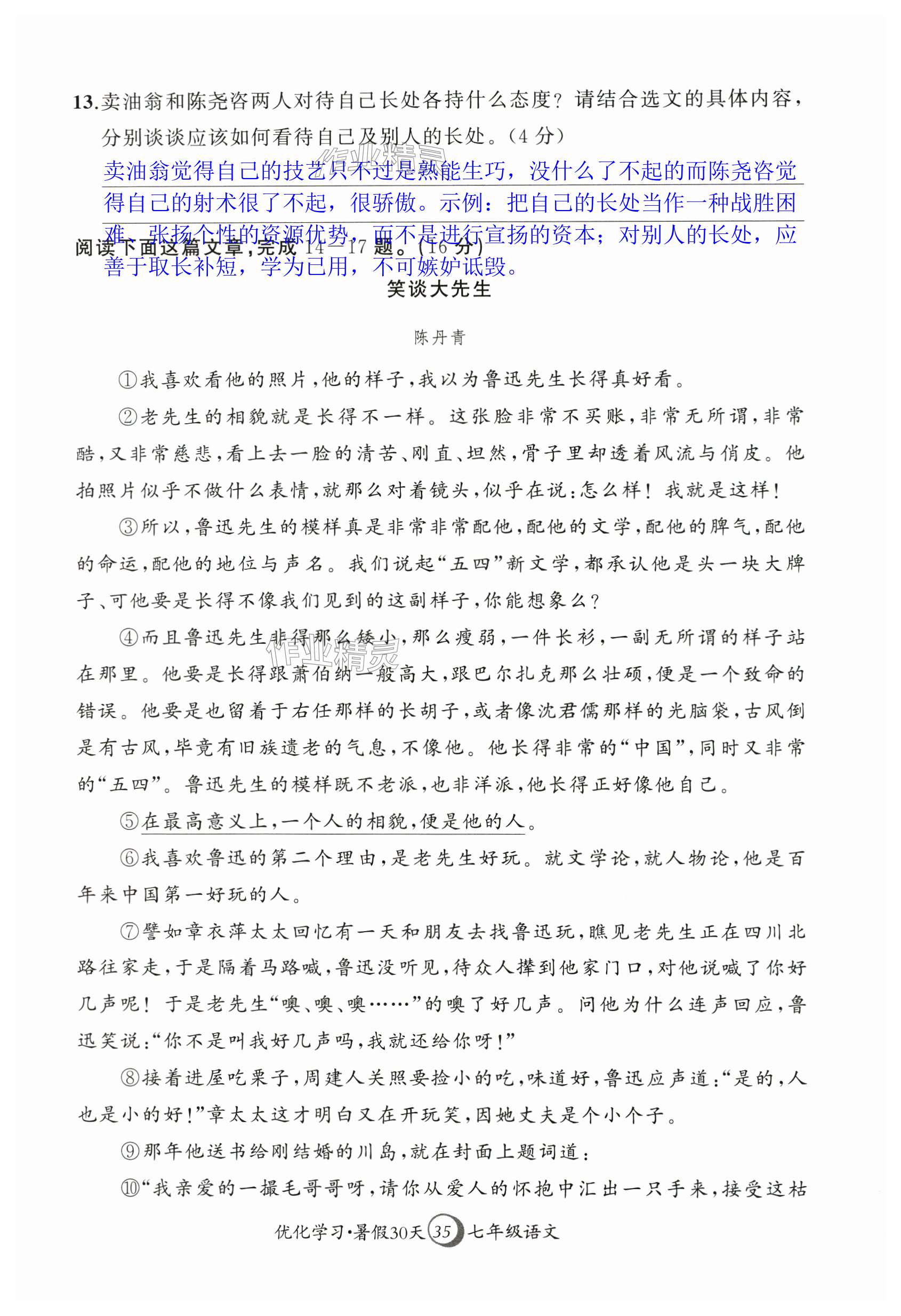 注:目前有些书本章节名称可能整理的还不是很完善,但都是按照顺序排列的,请同学们按照顺序仔细查找。练习册 2024年优化学习暑假30天七年级语文河海大学出版社 答案主要是用来给同学们做完题方便对答案用的,请勿直接抄袭。