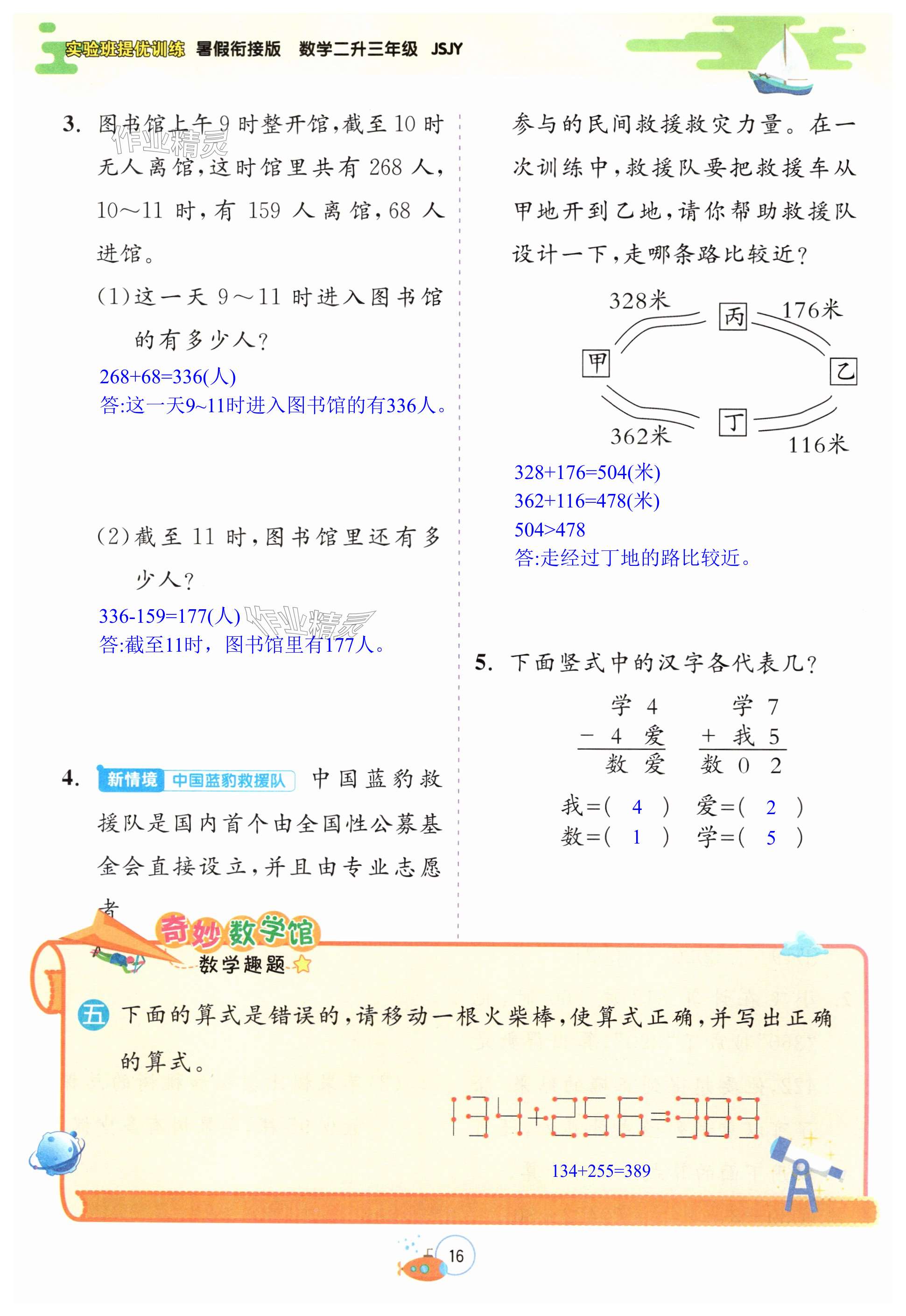 注:目前有些书本章节名称可能整理的还不是很完善,但都是按照顺序排列的,请同学们按照顺序仔细查找。练习册 2024年实验班提优训练暑假衔接版二升三年级数学苏教版 答案主要是用来给同学们做完题方便对答案用的,请勿直接抄袭。