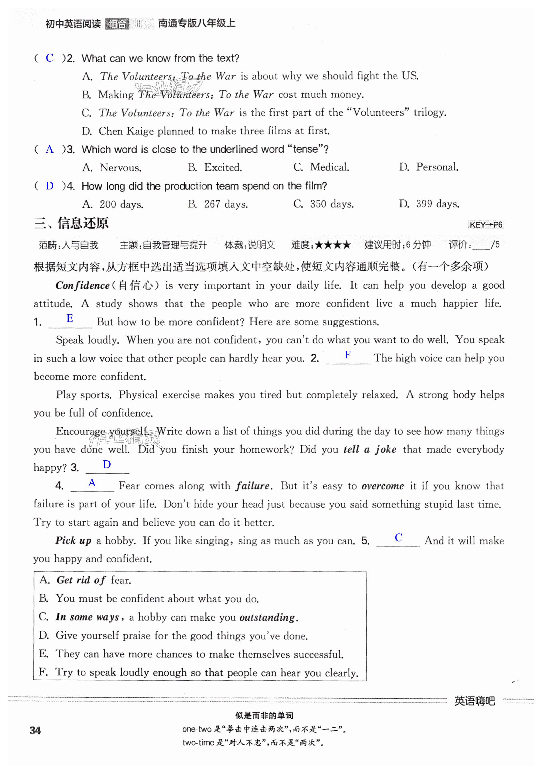 注:目前有些书本章节名称可能整理的还不是很完善,但都是按照顺序排列的,请同学们按照顺序仔细查找。练习册 2024年通城学典初中英语阅读组合训练八年级上册南通专版 答案主要是用来给同学们做完题方便对答案用的,请勿直接抄袭。