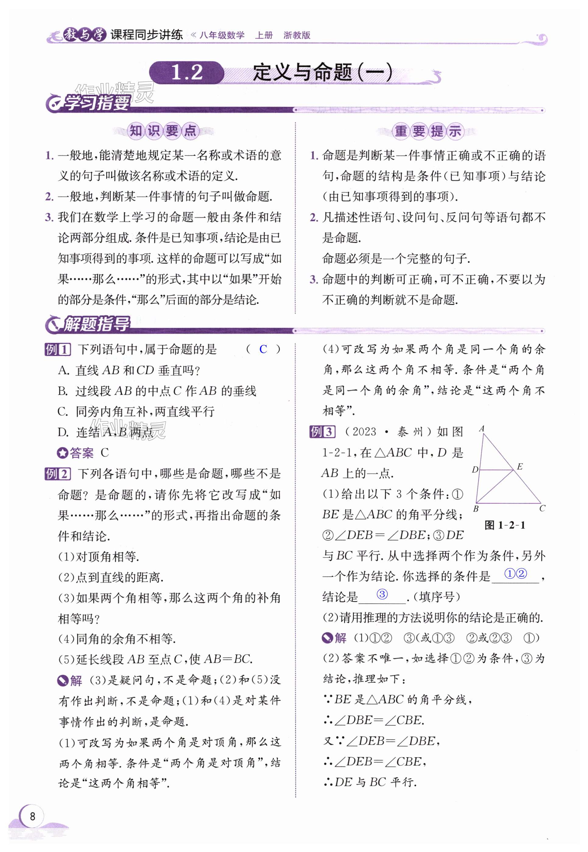 注:目前有些书本章节名称可能整理的还不是很完善,但都是按照顺序排列的,请同学们按照顺序仔细查找。练习册 2024年教与学课程同步讲练八年级数学上册浙教版 答案主要是用来给同学们做完题方便对答案用的,请勿直接抄袭。