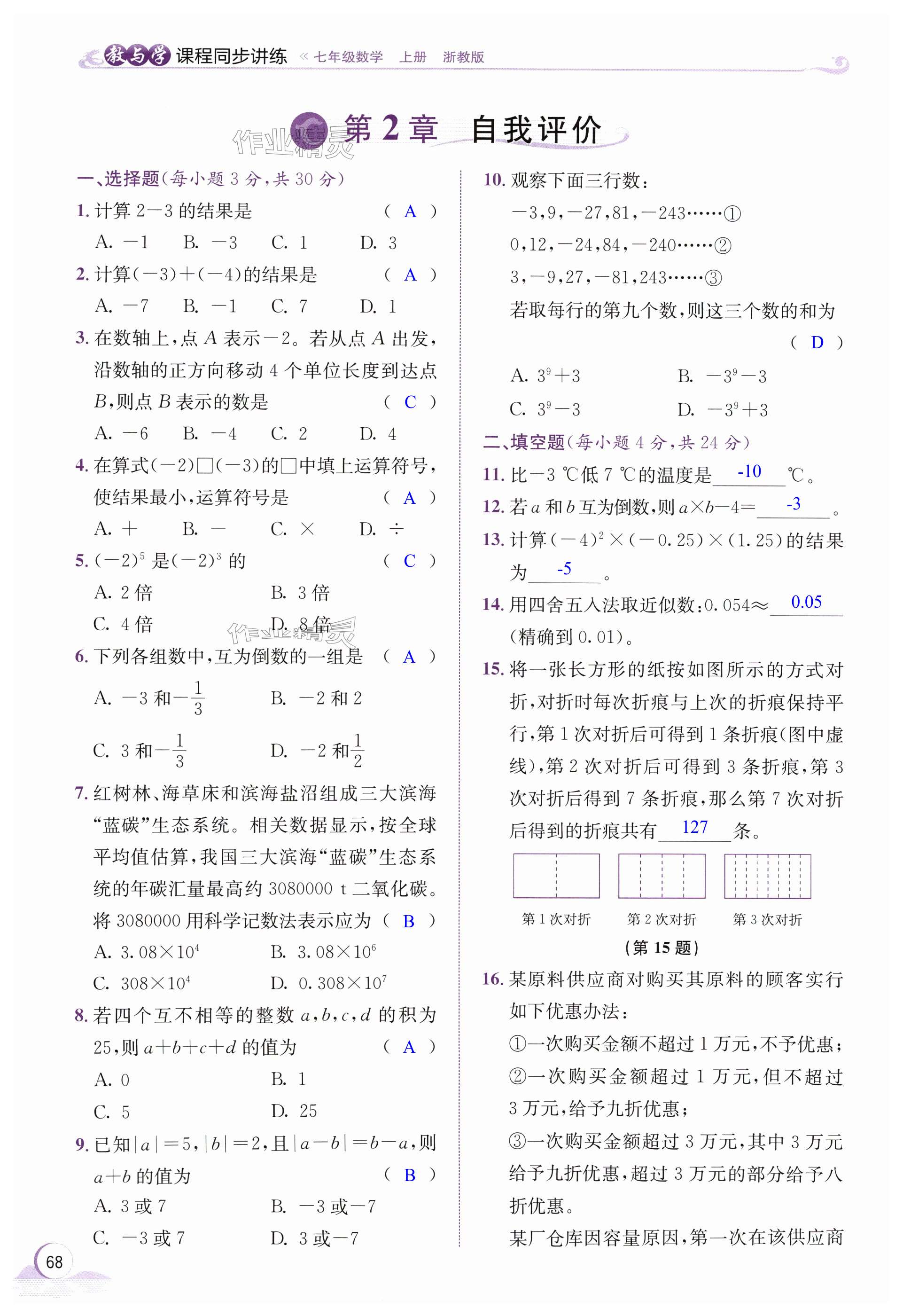 注:目前有些书本章节名称可能整理的还不是很完善,但都是按照顺序排列的,请同学们按照顺序仔细查找。练习册 2024年教与学课程同步讲练七年级数学上册浙教版 答案主要是用来给同学们做完题方便对答案用的,请勿直接抄袭。