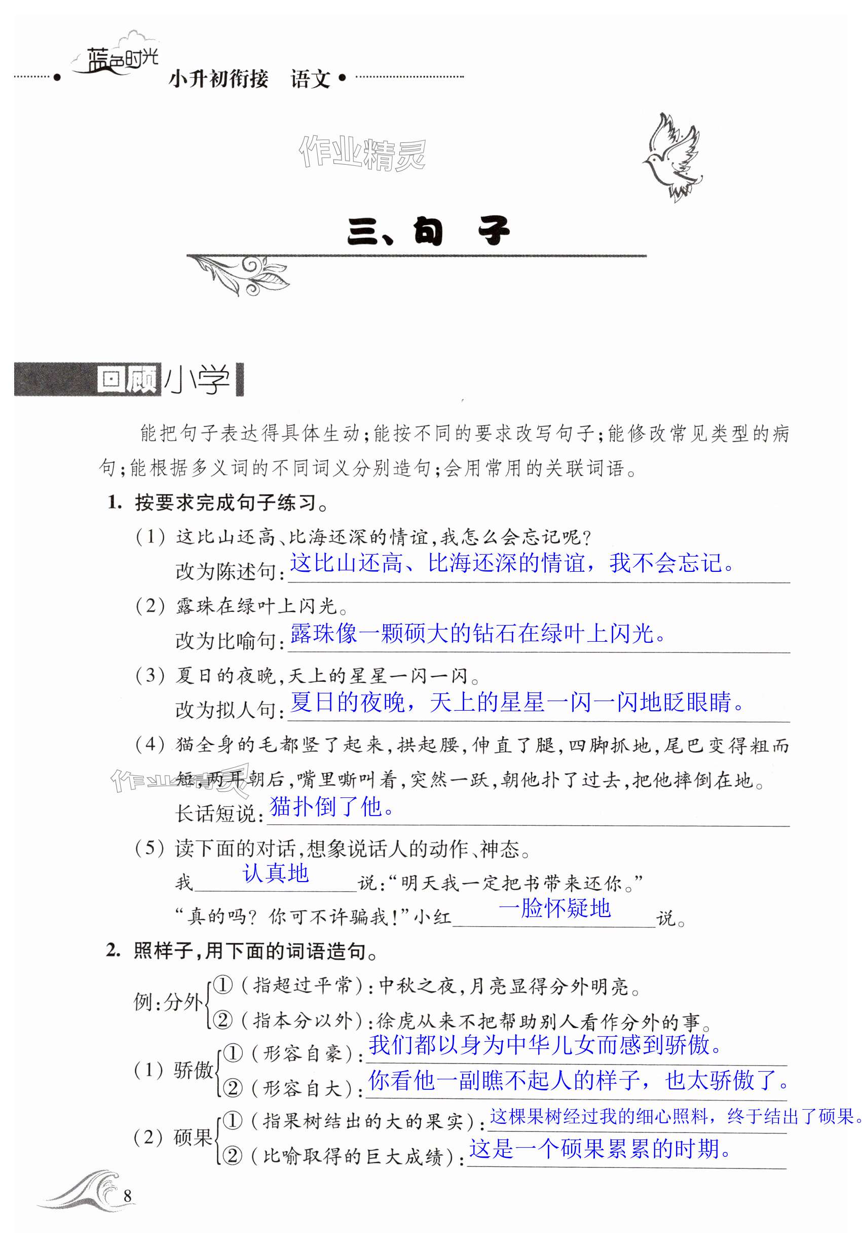 注:目前有些书本章节名称可能整理的还不是很完善,但都是按照顺序排列的,请同学们按照顺序仔细查找。练习册 2024年蓝色时光小升初衔接六年级语文 答案主要是用来给同学们做完题方便对答案用的,请勿直接抄袭。