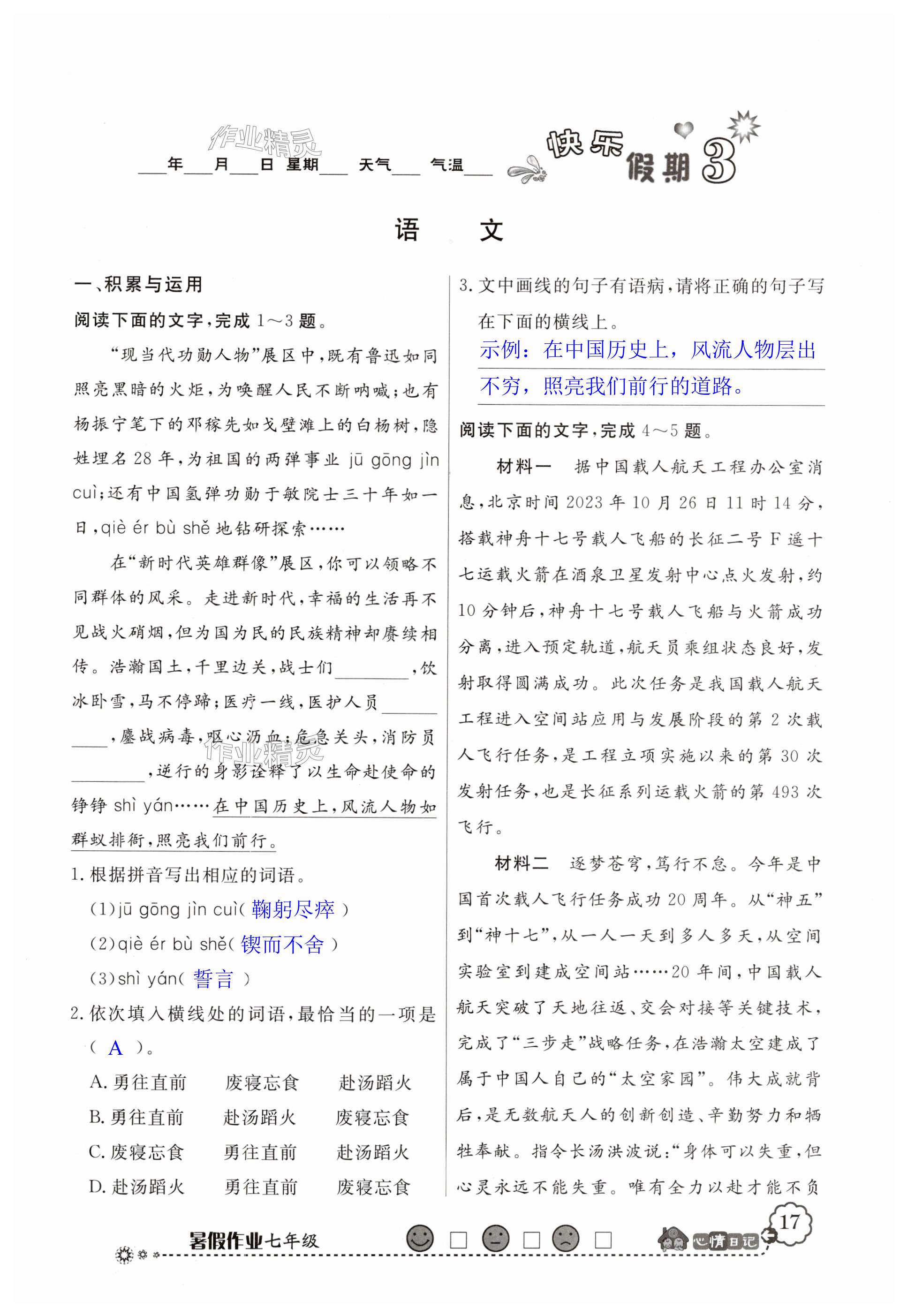 注:目前有些书本章节名称可能整理的还不是很完善,但都是按照顺序排列的,请同学们按照顺序仔细查找。练习册 2024年百年学典快乐假期暑假作业七年级综合北师大版 答案主要是用来给同学们做完题方便对答案用的,请勿直接抄袭。