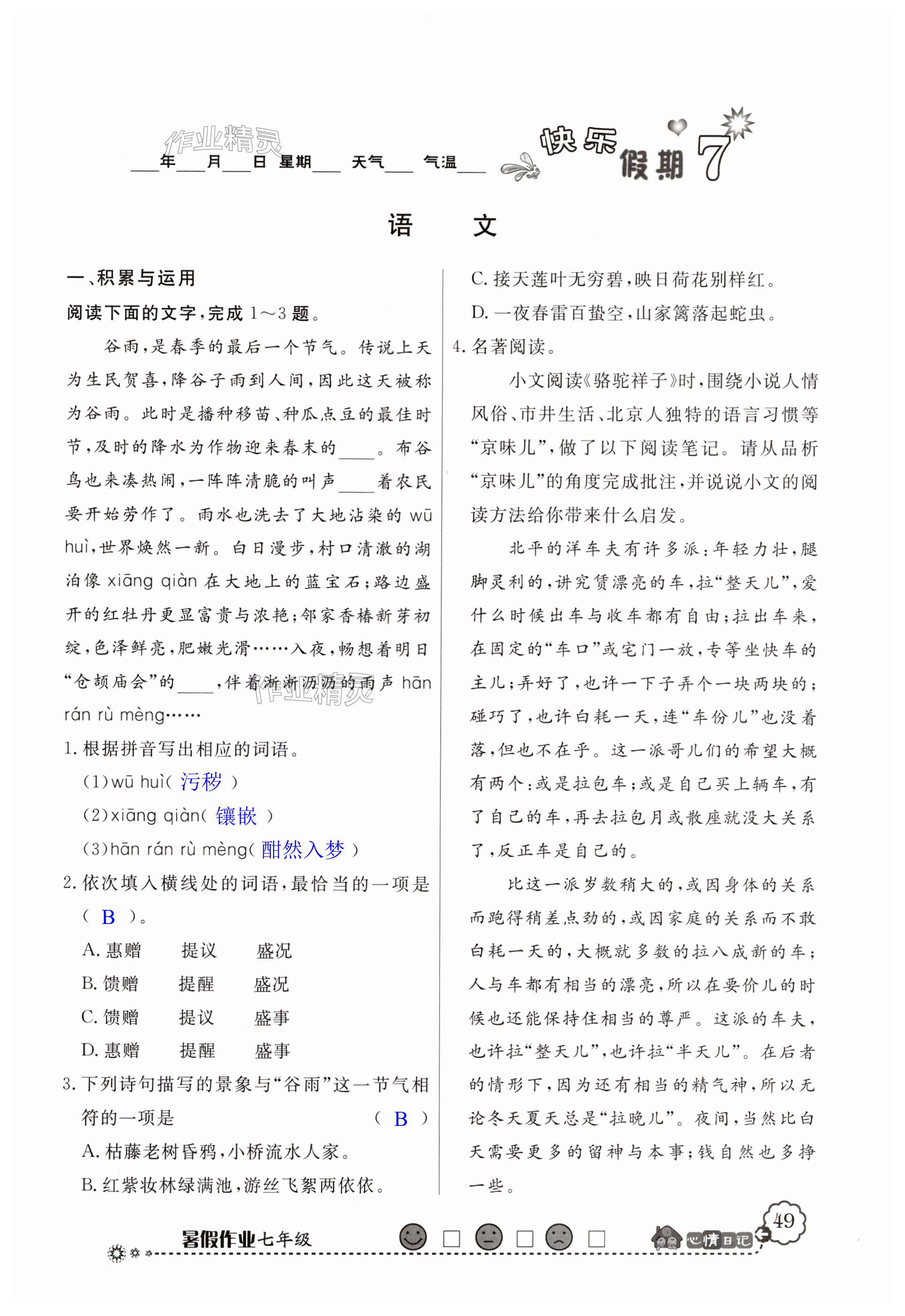 注:目前有些书本章节名称可能整理的还不是很完善,但都是按照顺序排列的,请同学们按照顺序仔细查找。练习册 2024年百年学典快乐假期暑假作业七年级综合北师大版 答案主要是用来给同学们做完题方便对答案用的,请勿直接抄袭。
