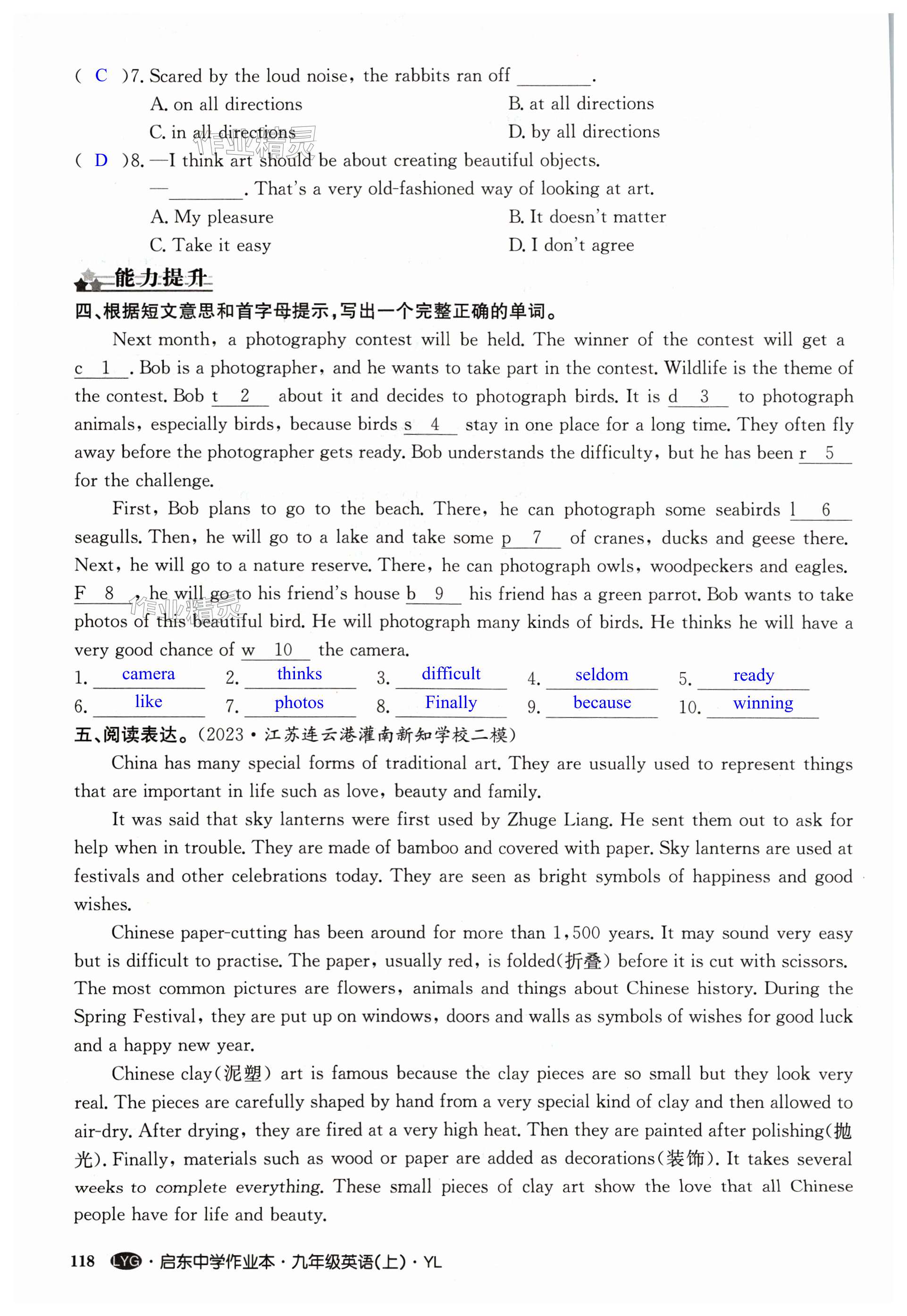 注:目前有些书本章节名称可能整理的还不是很完善,但都是按照顺序排列的,请同学们按照顺序仔细查找。练习册 2024年启东中学作业本九年级英语上册译林版连云港专版 答案主要是用来给同学们做完题方便对答案用的,请勿直接抄袭。