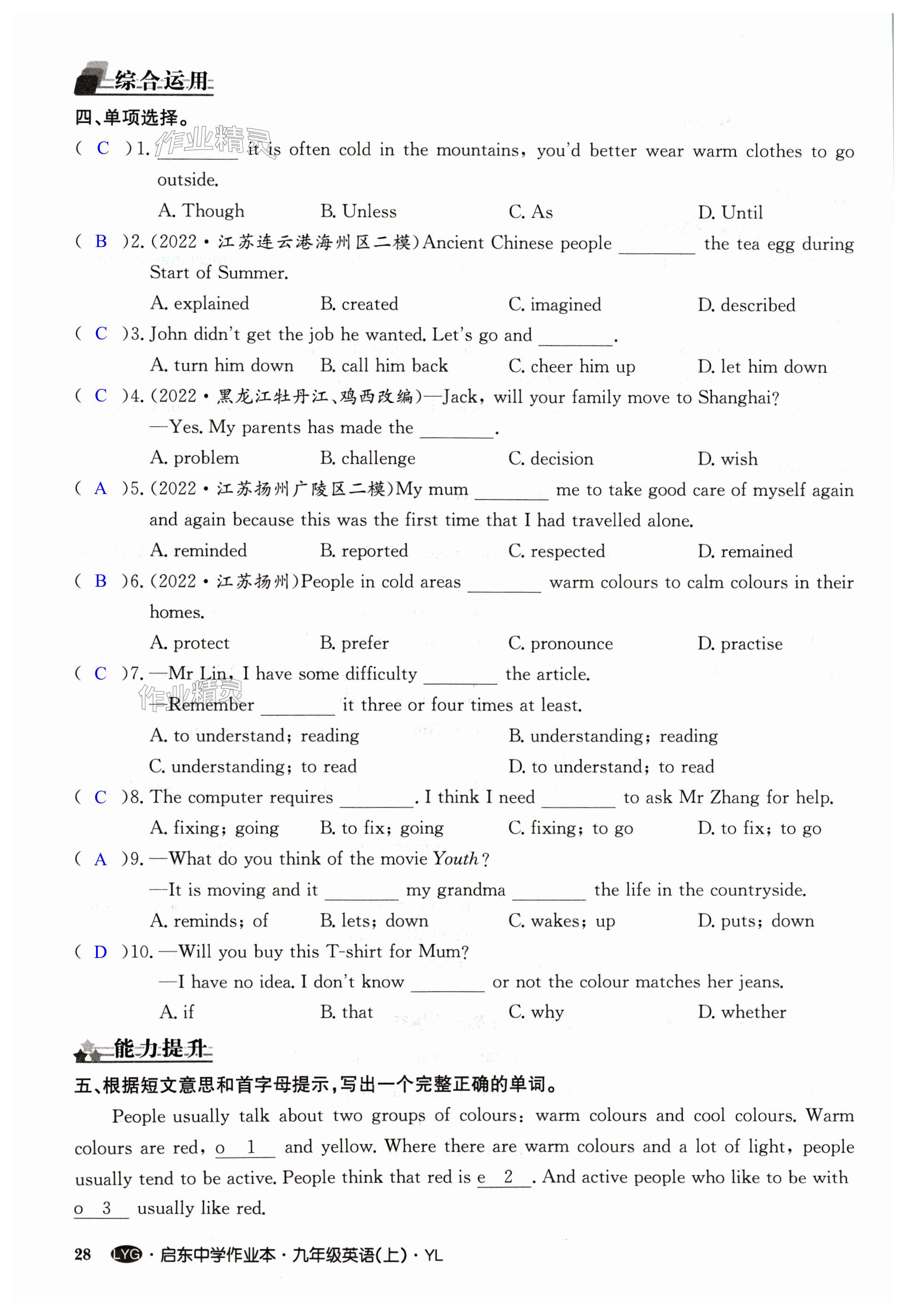 注:目前有些书本章节名称可能整理的还不是很完善,但都是按照顺序排列的,请同学们按照顺序仔细查找。练习册 2024年启东中学作业本九年级英语上册译林版连云港专版 答案主要是用来给同学们做完题方便对答案用的,请勿直接抄袭。