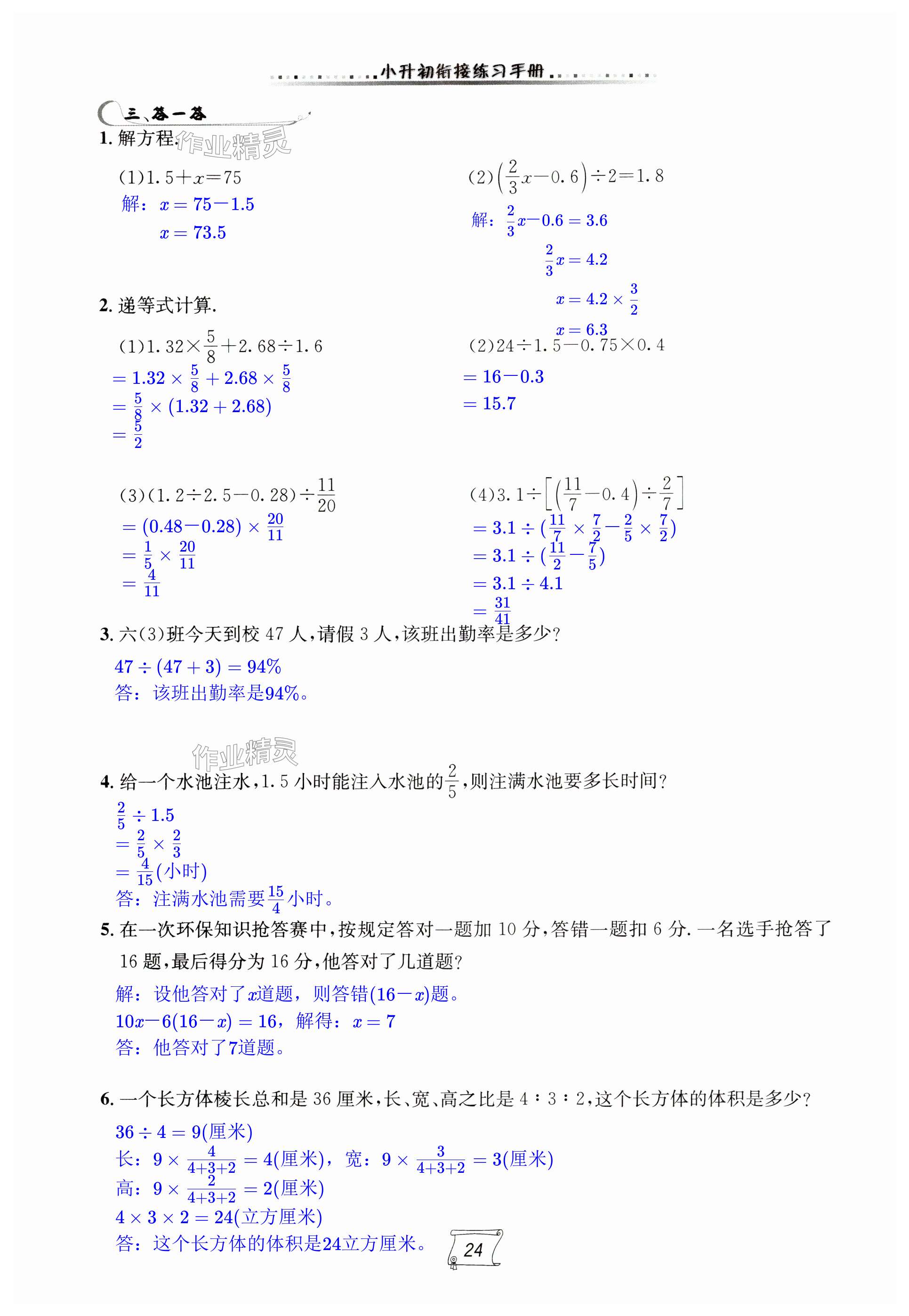 注:目前有些书本章节名称可能整理的还不是很完善,但都是按照顺序排列的,请同学们按照顺序仔细查找。练习册 2024年小升初衔接练习手册六年级数学.科学 答案主要是用来给同学们做完题方便对答案用的,请勿直接抄袭。
