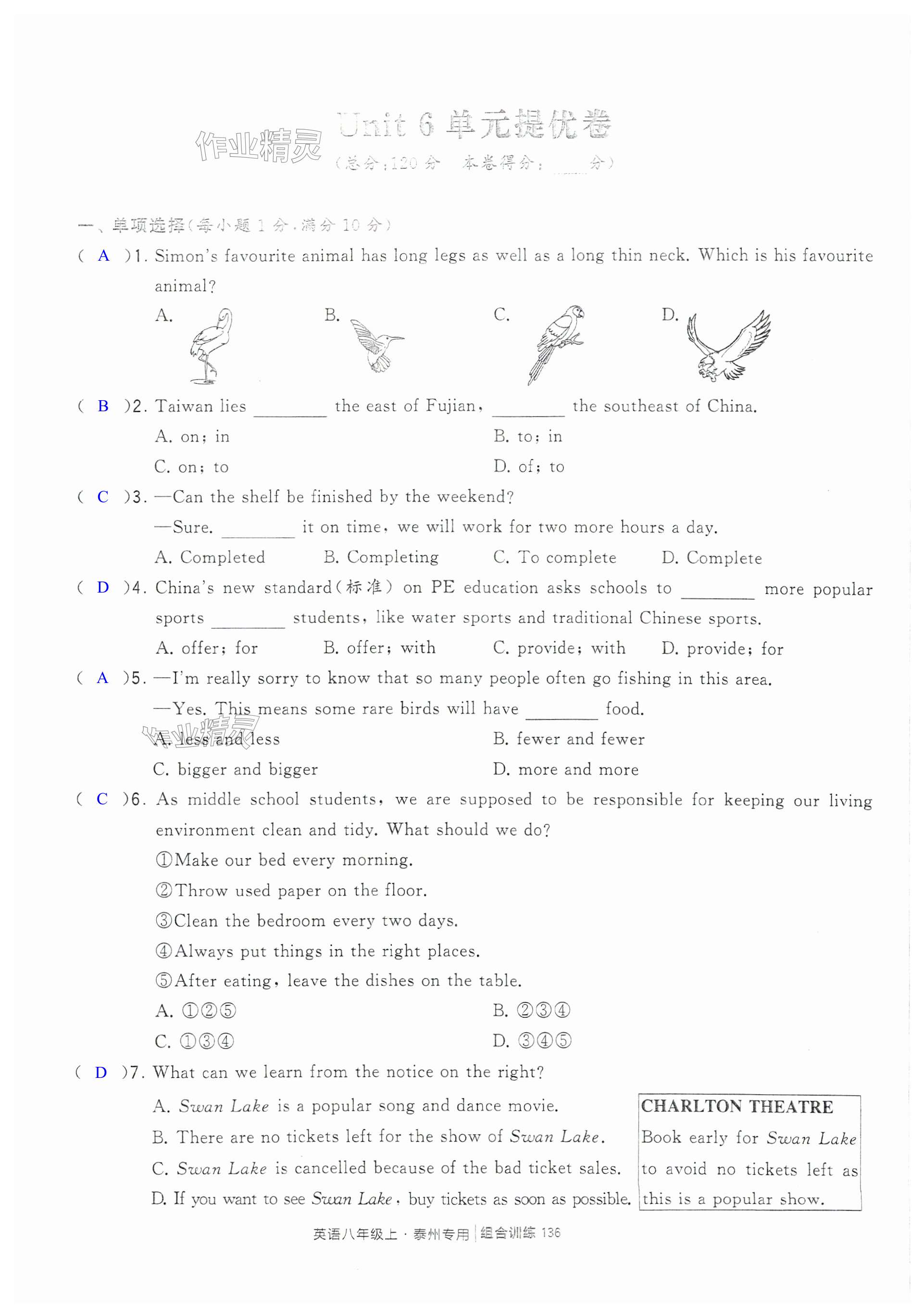 注:目前有些书本章节名称可能整理的还不是很完善,但都是按照顺序排列的,请同学们按照顺序仔细查找。练习册 2024年学霸组合训练八年级英语上册译林版泰州专版 答案主要是用来给同学们做完题方便对答案用的,请勿直接抄袭。