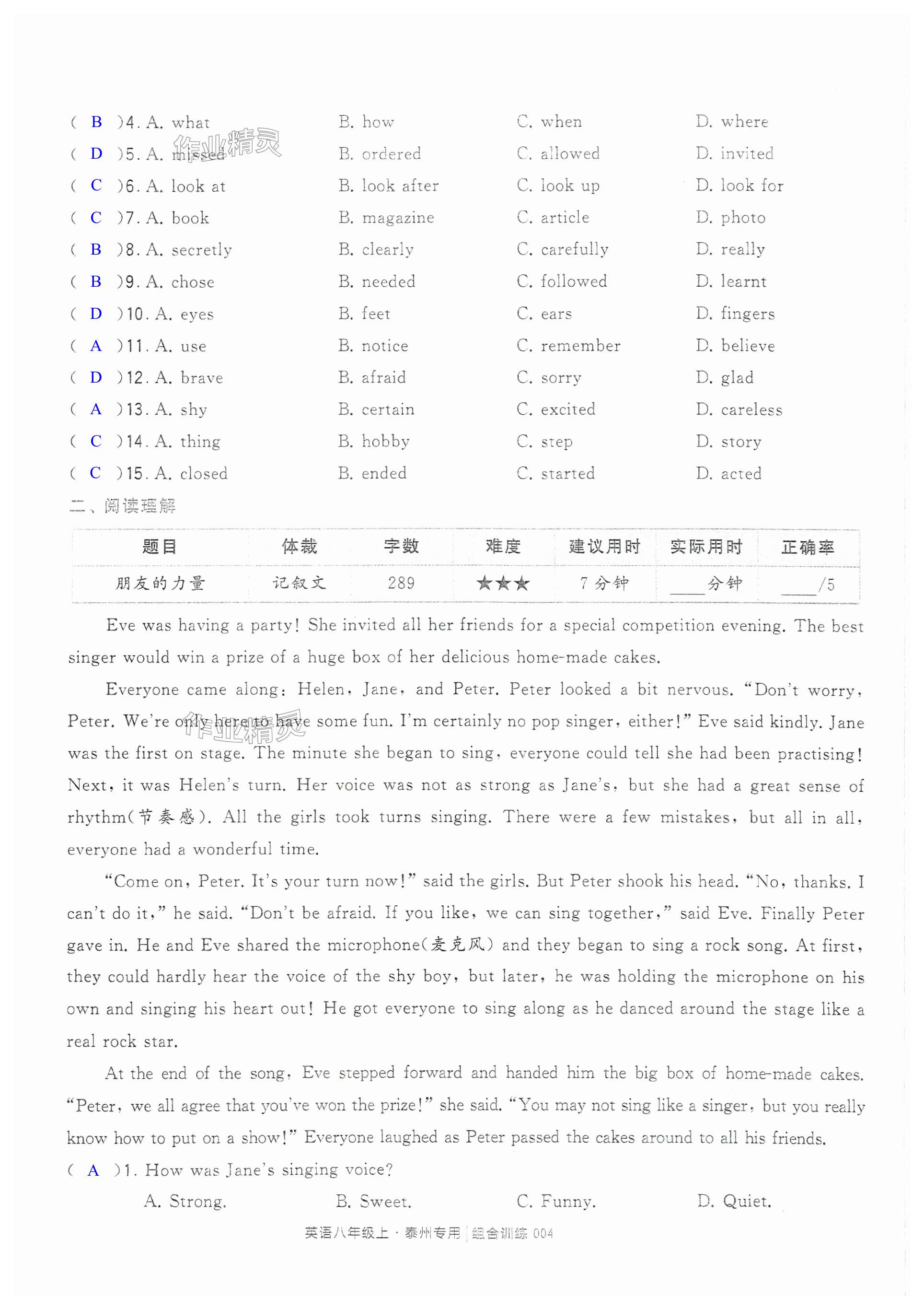 注:目前有些书本章节名称可能整理的还不是很完善,但都是按照顺序排列的,请同学们按照顺序仔细查找。练习册 2024年学霸组合训练八年级英语上册译林版泰州专版 答案主要是用来给同学们做完题方便对答案用的,请勿直接抄袭。