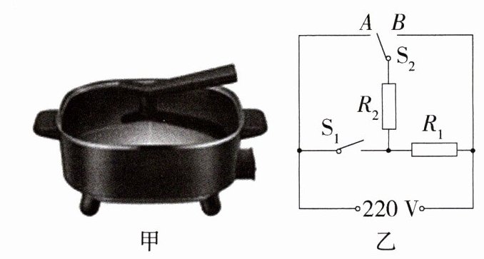 6. 新课标·科学论证(2024广东深圳南山期末)图甲是一款多功能电煮锅,图乙为该电煮锅简化电路图,其中开关$S_2$可以断开、接A或接B,$R_1$和$R_2$都是用于加热的纯电阻,电煮锅的部分参数如表所示。($R_1$和$R_2$的电阻值不随温度变化而变化)(P9302002)