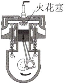 解析 由图可知,内燃机的顶端是火花塞,所以该内燃机是汽油机。图中内燃机的两气门都关闭,火花塞点火,活塞向下运动,是做功冲程。热机在工作过程中,排放废气、克服摩擦做功等会带走大量的热量,所以若内燃机一个工作循环对外做功30J,则燃料完全燃烧所放出的热量一定大于30J。