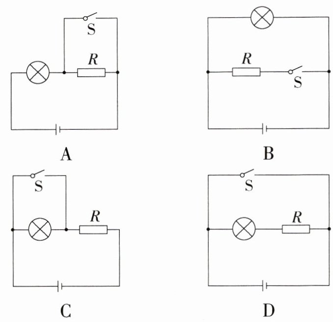 C A、B电路图中,无论开关断开还是闭合,灯泡都发光,故A、B错误;C电路图中,开关断开,灯泡和保护电阻串联,能够发光;开关闭合,灯泡被短路不能发光,故C正确;D电路图中,开关断开,灯泡与保护电阻串联,能够发光;开关闭合造成电源短路,故D错误。故选C。