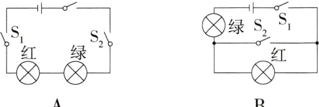7.新情境·安全与健康 (2023江苏宿迁中考,7,★★☆)下列电路中,符合直行方向交通信号灯(只考虑红灯和绿灯)模拟设计的是(P9302004) ( )