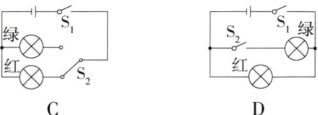 C 交通信号灯的红灯与绿灯工作时互不影响,所以两灯是并联关系;工作时通过开关控制电路中只有红灯工作或只有绿灯工作,故只有C符合要求。