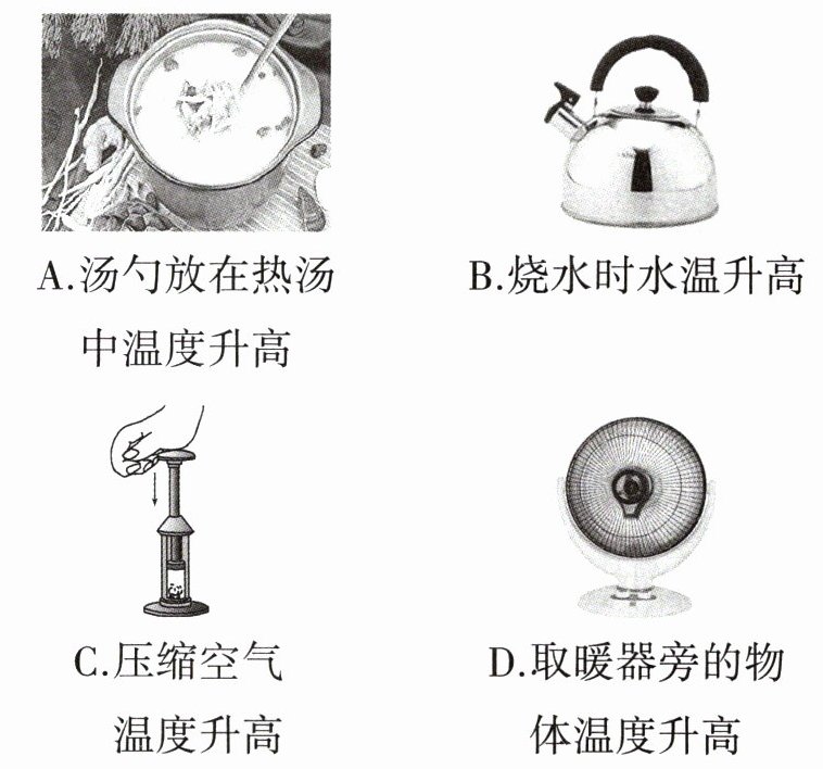 C 神舟十三号载人返回舱与大气摩擦温度升高,内能增加,是通过克服摩擦做功来改变内能的。汤勺放在热汤中温度升高,烧水时水温升高,取暖器旁的物体温度升高,都是通过热传递来改变物体内能的;压缩空气温度升高,是活塞对筒内空气做功,使筒内空气的内能增大,温度升高,是通过做功来改变物体内能的。选C。