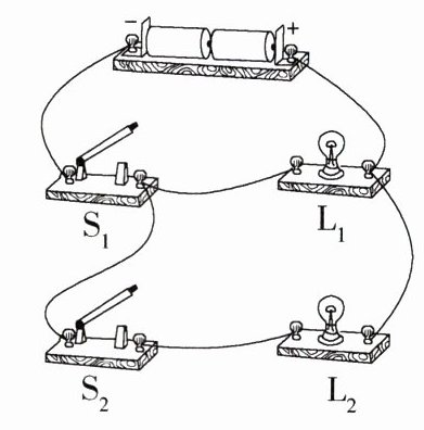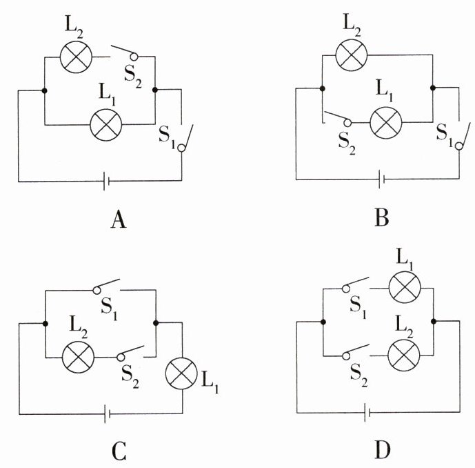 A 由实物图知,两灯并联,开关S₁在干路上控制整个电路,S₂在L₂支路,故A与实物图相符。