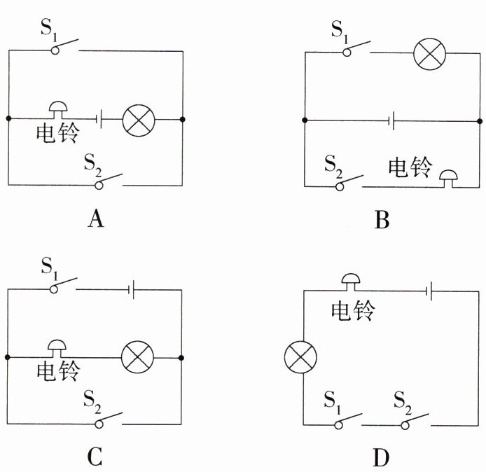 3. 新情境·安全与健康(2023江苏南京江宁期末)体温安检门的门头装有高精度的体温检测探头,能够测量人体额头的温度;门中建立有电磁场,能够探测人体是否携带金属物品。当人体温度过高(S₁闭合)或人身上携带金属物品(S₂闭合)时,报警指示灯就会亮起且电铃发出报警声。下面的简化电路图符合要求的是 ( )