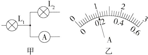 B 由题知,灯L₁、L₂并联,则L₁、L₂分别在两个支路,由图甲知,电流表应在干路上,因并联电路干路电流等于各支路电流之和,所以电流表示数应大于通过灯L₁的电流,由图乙中电流表指针位置知,电流表应使用大量程,示数为1 A,所以通过灯L₂的电流I₂ = I - I₁ = 1 A - 0.6 A = 0.4 A,故A、C错误,B正确;由并联电路特点知,若L₂被电流表短接,则L₁、L₂组成的整个并联电路就会被短路,故D错误。