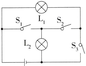 解析 闭合$S_{2}$时电流只有一条路径,两电灯串联;要使电灯L₁和L₂组成并联电路,即电流有两条路径,需同时闭合$S_{1}$和$S_{3}$,断开$S_{2}$;同时闭合$S_{1}$、$S_{2}$、$S_{3}$时电流会不经用电器直接从电源正极流向负极,属于电源短路,有可能会烧坏电源。