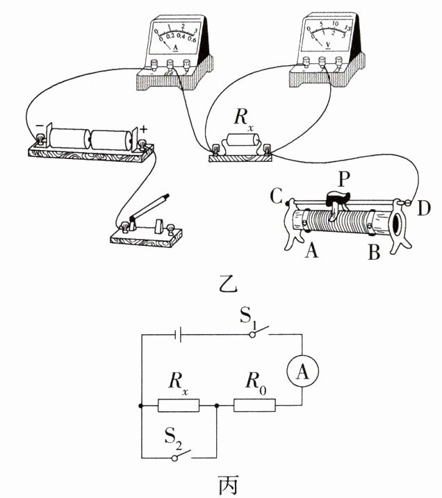 (3)若撤去电压表和滑动变阻器,新增一个阻值为$R_{0}$的定值电阻,利用如图丙所示的实验电路,也可以测量待测电阻$R_{x}$的阻值。