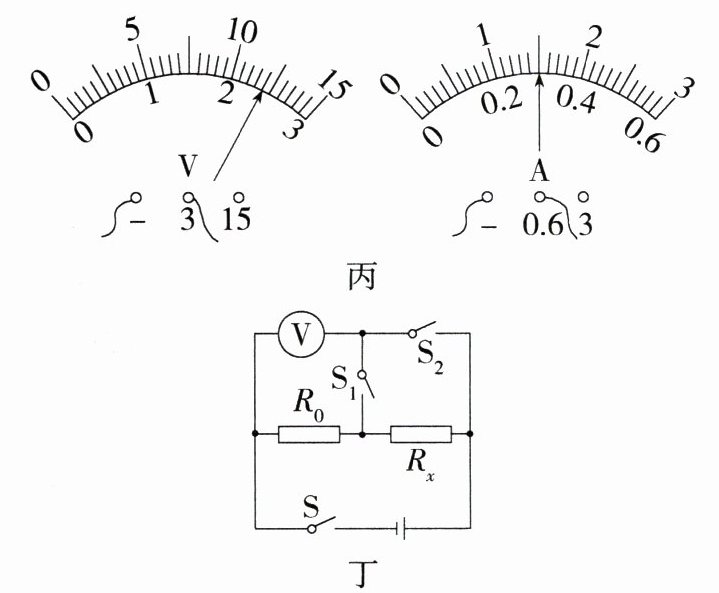 (4)黄同学的电流表坏了无法读数,她设计了如图丁所示的电路测量未知电阻$R_{x}$的大小($R_{0}$阻值已知)。下面是她的实验过程,请你帮她完成实验。