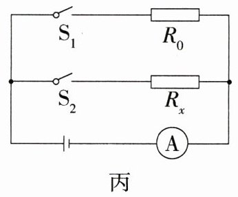 (4)小致又想测未知电阻$R_{x}$的阻值,但电压表损坏了,于是他设计了如图丙所示电路($R_{0}$为已知阻值的定值电阻),并设计了如下实验步骤,请帮他写出$R_{x}$表达式。