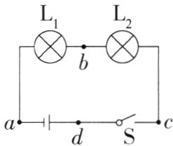 由电路图知,两灯串联;如果灯L₁断路,用一段导线的两端接触a、b两点时,灯L₂是发光的,与题意不符,故A错误;如果灯L₂断路,导线接触b、c两点时,L₁会发光,与题意不符,故B错误;如果灯L₁短路,则灯L₂是发光的,与题意不符,故C错误;如果开关断路,导线接触c、d两点时,电路是通路,两灯都发光,符合题意,故D正确。