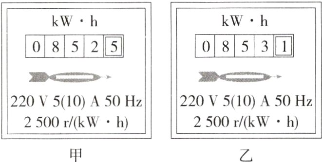 5.(教材变式·P90T2)(2024广东普宁期末)小刚假期外出时,断开家中的其他用电器,只让电视机处于待机状态,初始时电能表示数如图甲,60 h后电能表示数如图乙,则下列说法正确的是