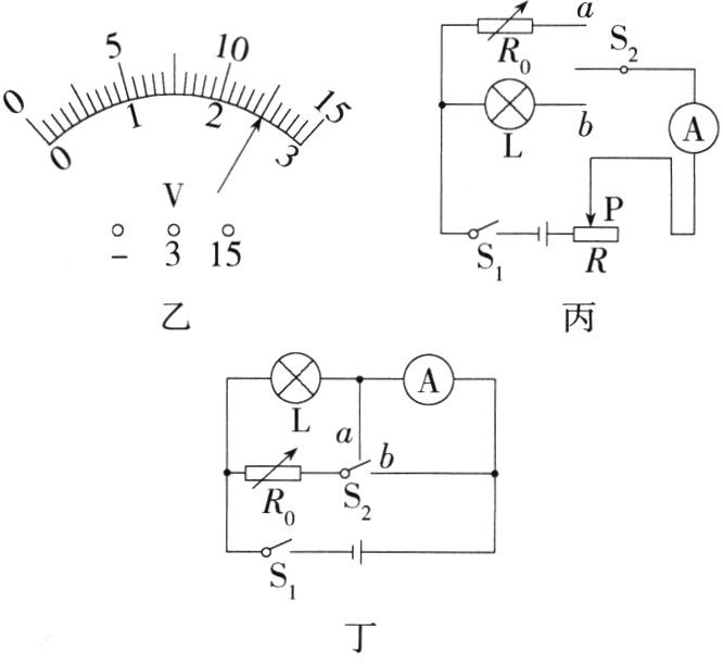 (4)在实验过程中,某组同学电压表发生故障,现增加电阻箱和单刀双掷开关,设计了如图丙、丁两种方案,则能测出灯泡额定功率的方案是______(选填"丙"或"丁"),简单描述测量方法____________________(用符号表示出需要记录的物理量,灯泡的额定电流用$I_{额}$表示);用已知量和测量量表示灯泡额定功率$P_{额}=$______。