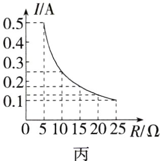 (2)灯泡的功率测量完毕,小明用5 Ω、10 Ω、15 Ω、20 Ω、25 Ω的定值电阻更换电路中的灯泡,探究电流跟电阻的关系,得到如图丙所示的电流I随电阻R变化的图像,则小明应选用滑动变阻器______(选填"$R_{1}$"或"$R_{2}$")。